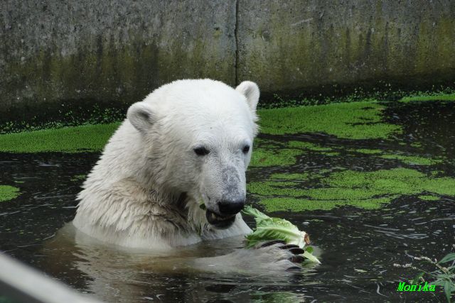 Herrscht wegen der Hitze Möhrenknappheit im Zoo? Gianna bekam heute auf der Anlage keine. Also mauste sie die Reste von Knut's verbliebenem Futter. Um den Salat kam es zu einem kurzen Kampf aus dem Gianna als Siegerin hervorging