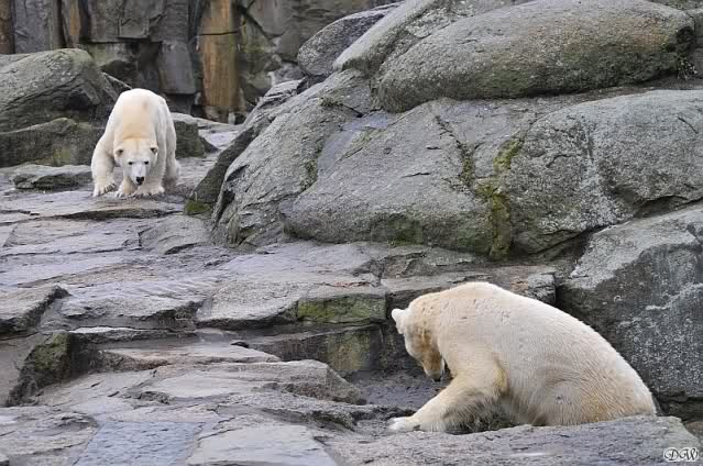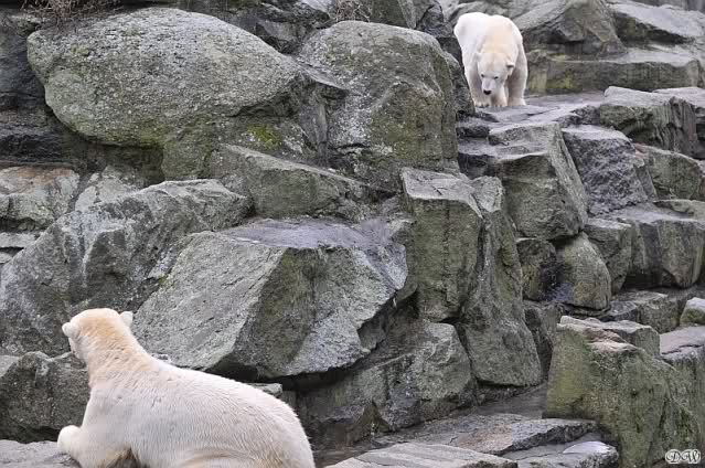 Katjuscha hatte eine fantastische Zeit: Sie spielte "Jagd auf Knut". Sie stand wie angewurzelt oben und beobachtete Knut. Dabei schloss sie auch, wie üblich, hin und wieder die Augen. Einen solchen Moment nutzte Knut voll aus und schlich auf die Anlage. Erst schaute er nach Tosca, die ihre Schritte jedoch nicht unterbrach, dann bummelte er ein wenig weiter. Inzwischen war Kati aufgewacht, kam um den Felsen, sah Knut, gab Gas und raste auf ihn zu. Er lief hinter den letzten großen Felsen und stellte sich ihr brüllend entgegen. Sie machte einen kurzen Rückzug und Knut meinte das Theater sei vorbei. Weit gefehlt! Während er weiter schlenderte, drehte sie den Turbo auf und raste auf ihn zu. Er flitzte diesmal weg und Kati flog geradezu über die Felsen und folgte ihm. Also musste Knut von seinem unteren Stein wieder auf die Anlage klettern, Kati machte kehrt und traf ihn oben und die Verfolgungjagd begann auf's Neue. Als Knut wieder nach unten geflüchtet war, kam sie den Steilfelsen hinuntergesaust (das hatte ich vorher noch nie gesehen). Das war Knut dann doch zuviel und er brüllte sie an. Daraufhin lief sie zu seinem Plateau und zeigte ihm, wie schön es dort ist. Da er nicht folgte, ging sie nach oben und bezog ihren Beobachtungsposten. Knut blieb auf dem unteren Stein liegen, sie legte sich hin, immer Knut im Sichtwinkel und leckte sich die Tatzen. Sie sah sehr zufrieden mit sich und der Welt aus.