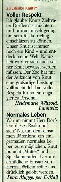 Als Knut klein war, haben u. a. Sie mit Ihrer Zeitung dazu beigetragen, dass viele, viele Leute in den Zoo gingen um den Kleinen zu sehen. Weshalb nun dieser Umschwung? Warum solche falschen Berichte? Bitte hören Sie endlich auf damit! Sie schaden Tier und Mensch damit.