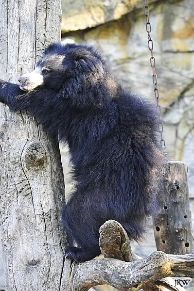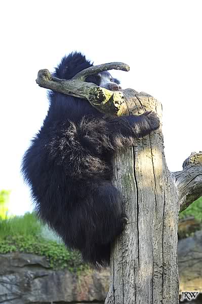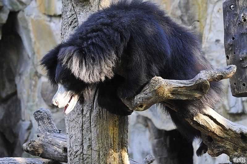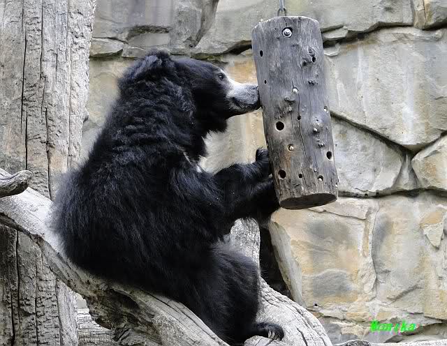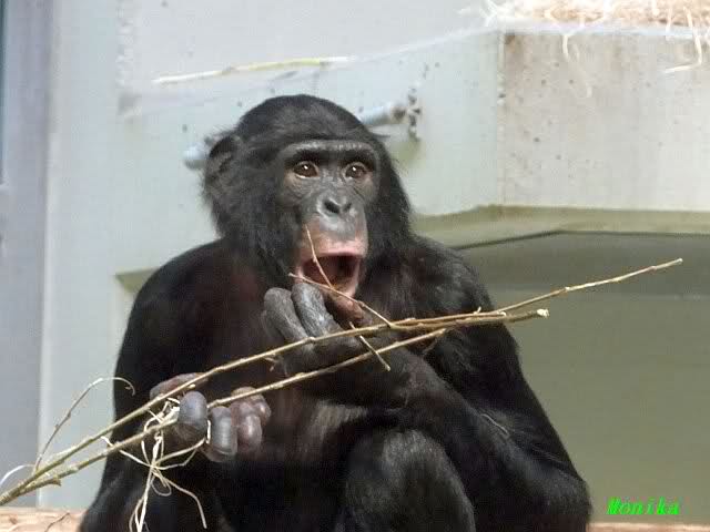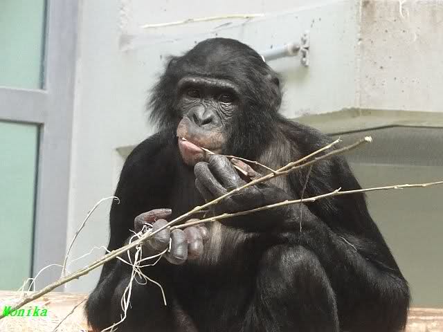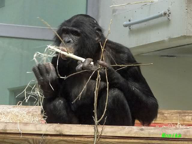 Bei Devi wurde Honig auf den Baumstämmen geschmiert. Sie leckte alles mit lautem schlürfen weg. Anschließend holte sie sich die Fruchtstücke aus der Hänge-Ampel. Als der Baulärm begann, versteckte sie sich wieder ängstlich im Höhleneingang.