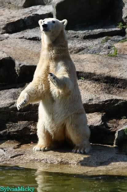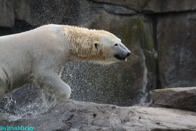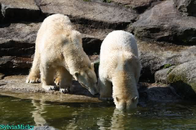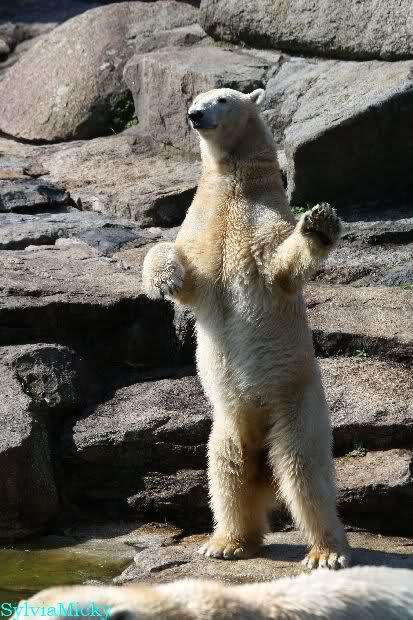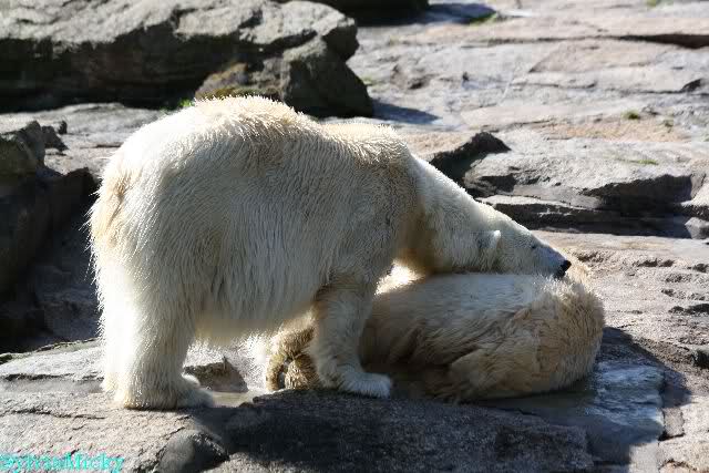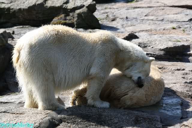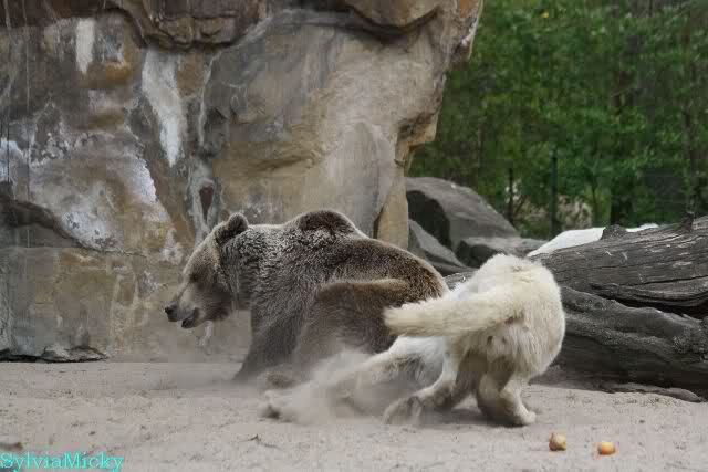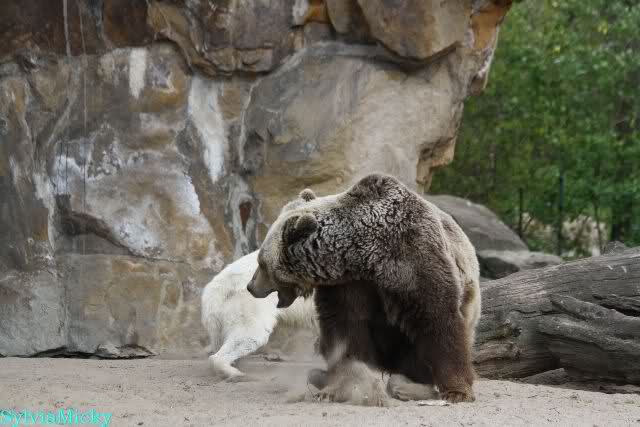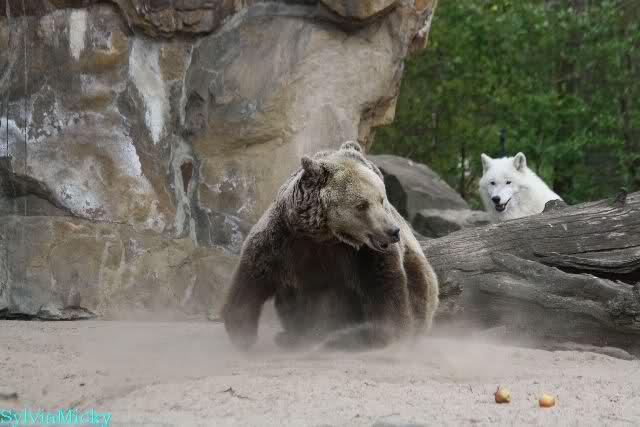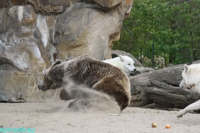 Petzi und Siddy mußten sich bei der Fütterung ganz schön heftig gegen die Wölfe wehren. Ich denke, der Biß eines Wolfes ist bestimmt schmerzhaft für die Bären aber die Pranke eines Bären könnte eventuell tödlich sein für die Wölfe.