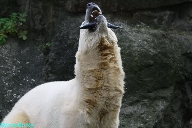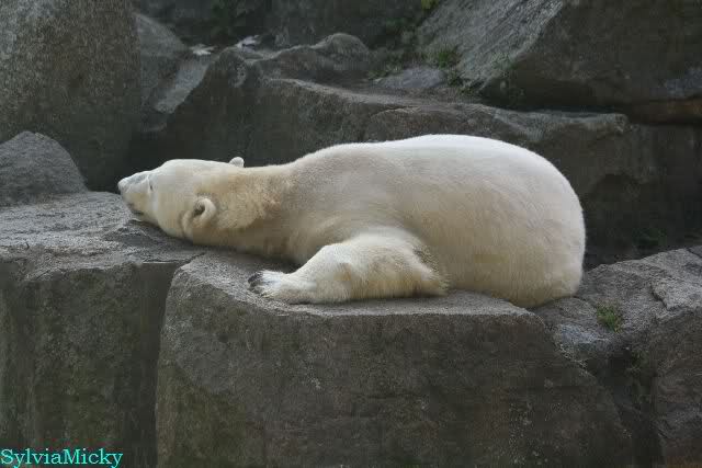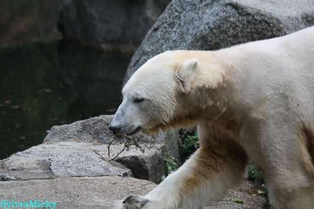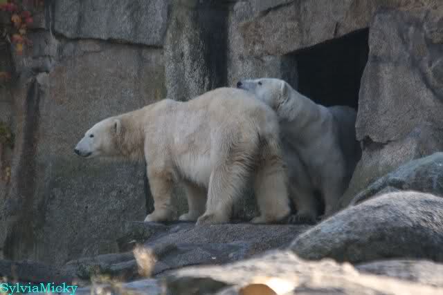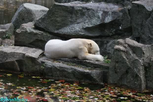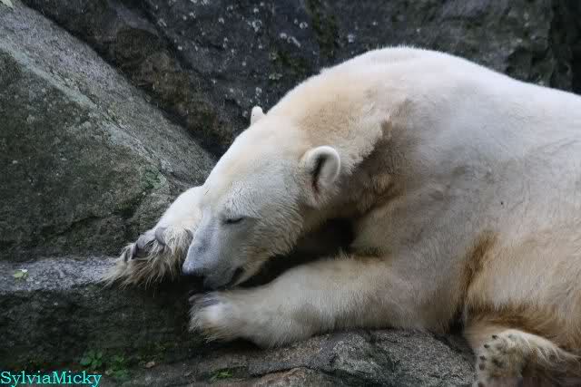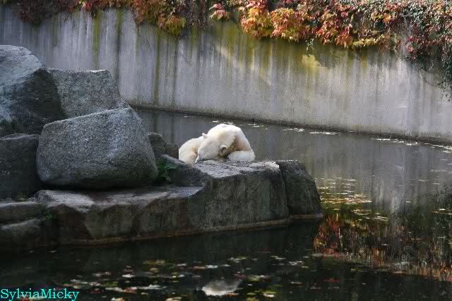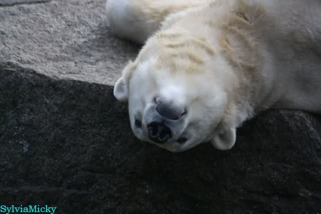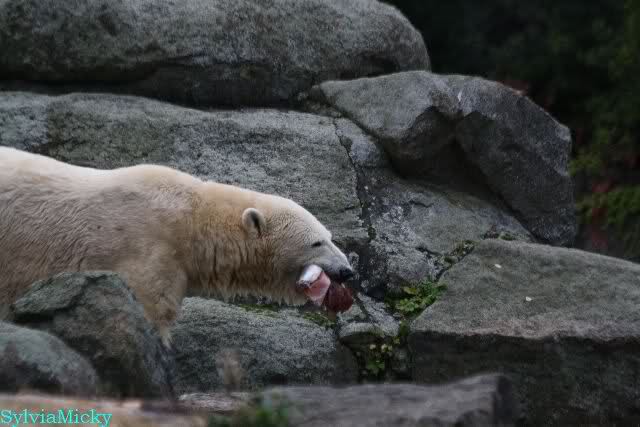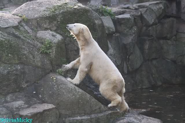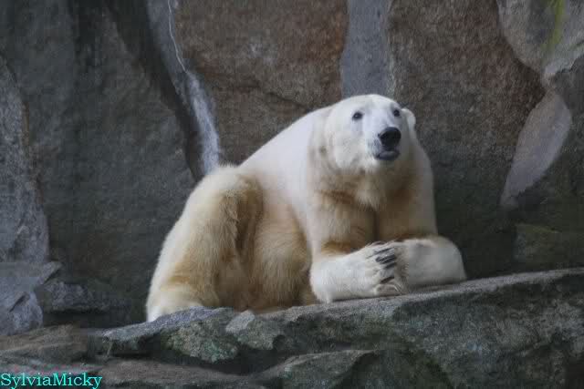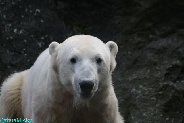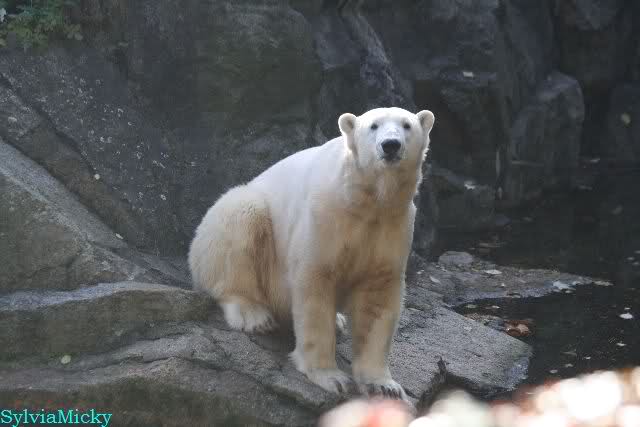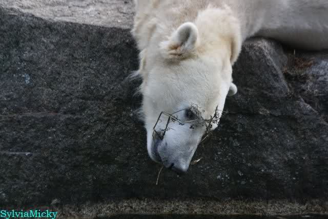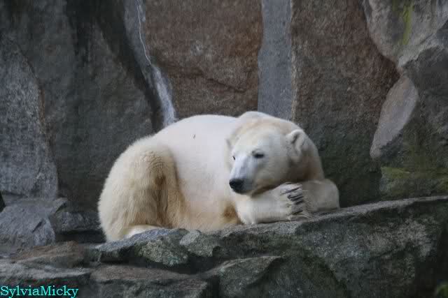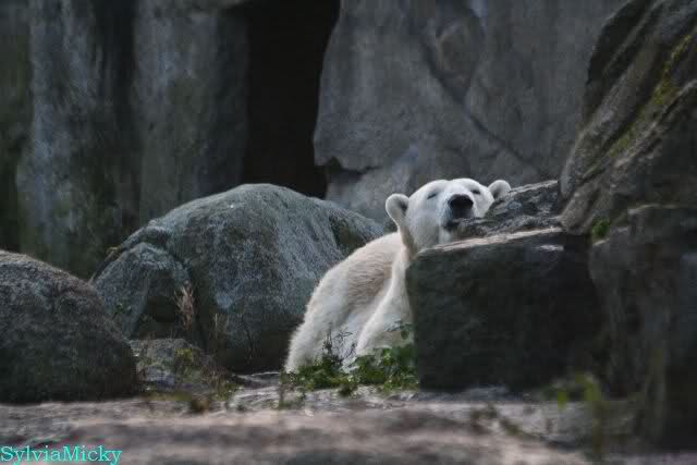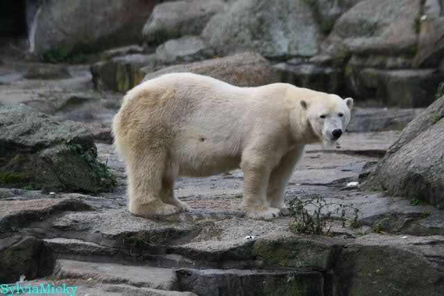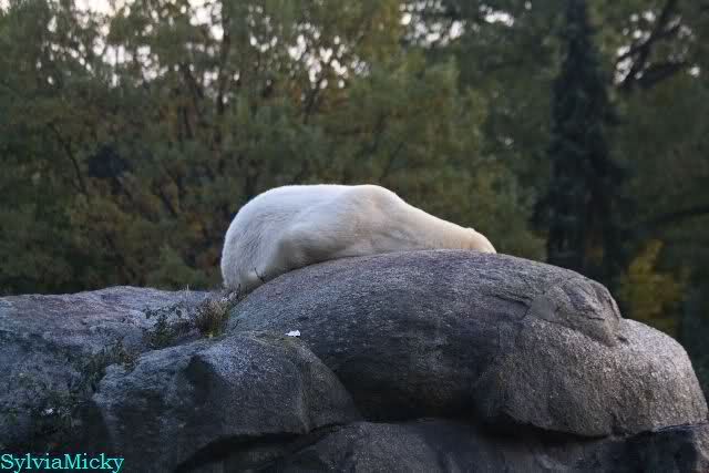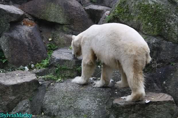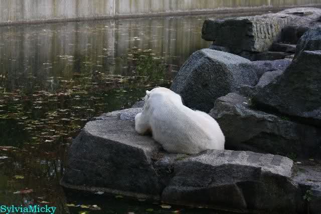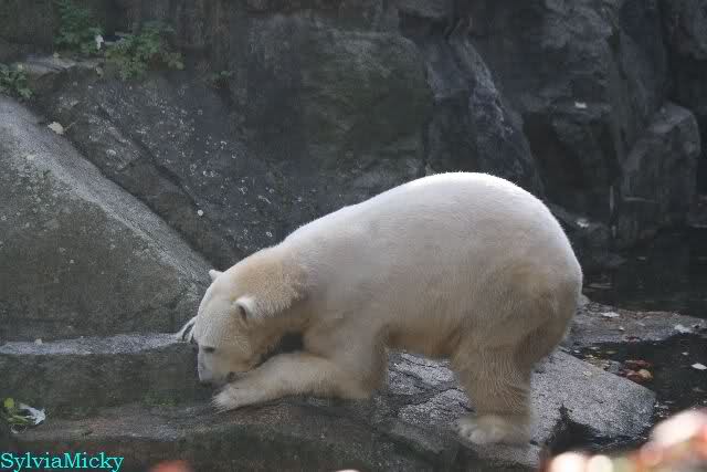 Good evening to you all Knut & Co. friends around the world at the end of Sunday here. Bad weather at afternoon. It was a short visit in Zoo for me. Polar bears in rain. No probs between the bears. Knut was sitting on his little place at the right side of the enclosure, looking what the bears were doing. Tosca and Kati were walking. And Nancy was sleeping behind the rocks.