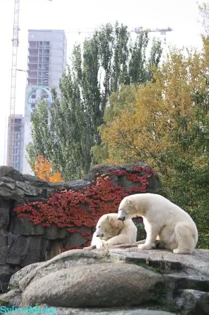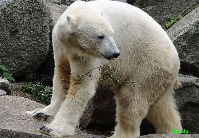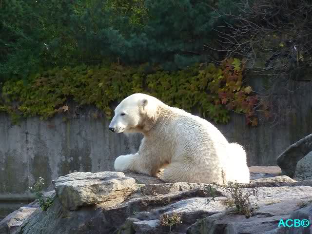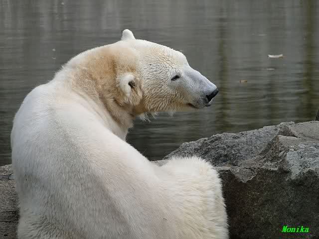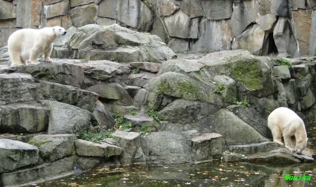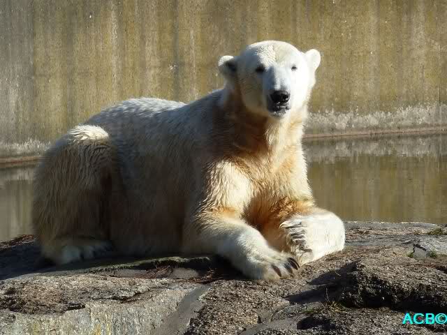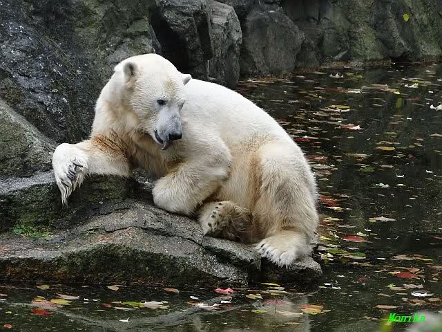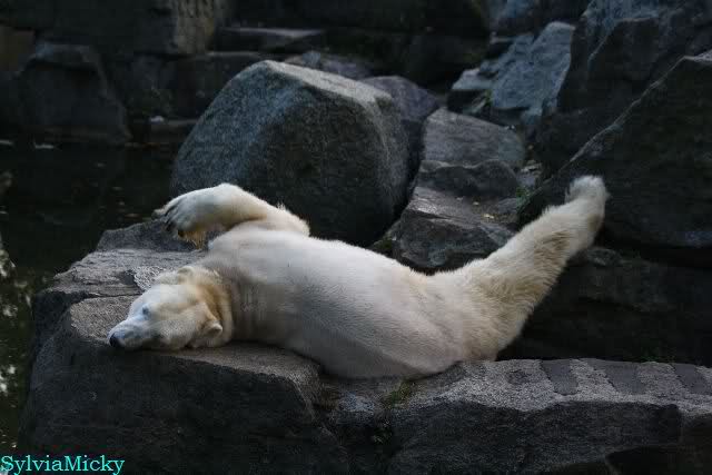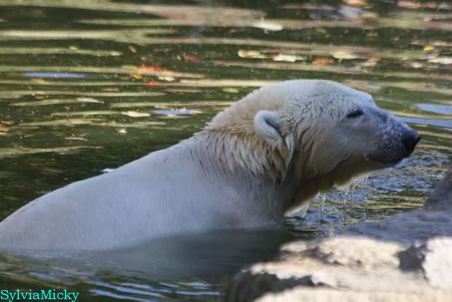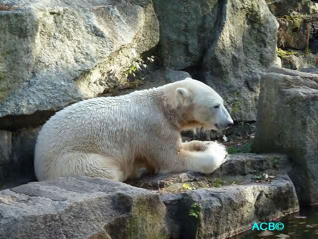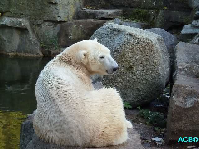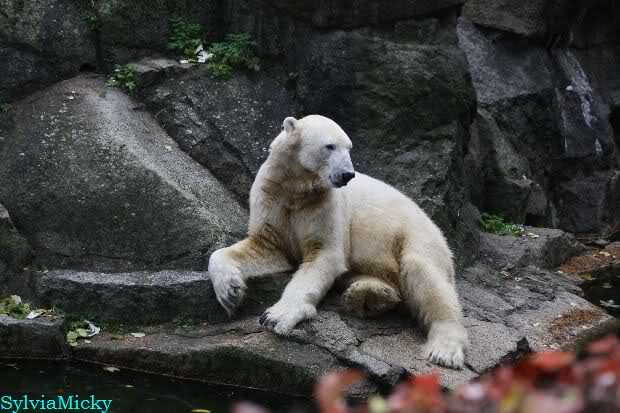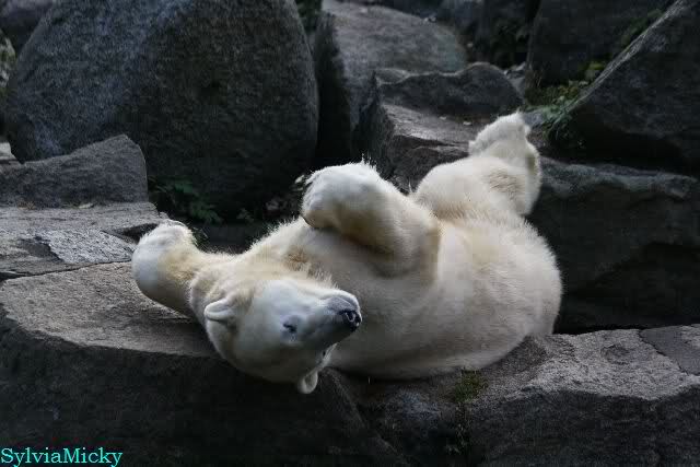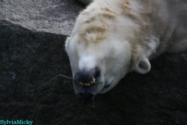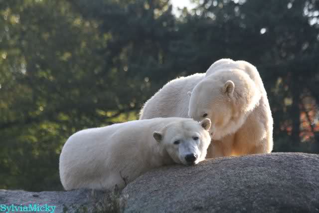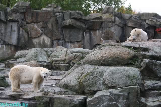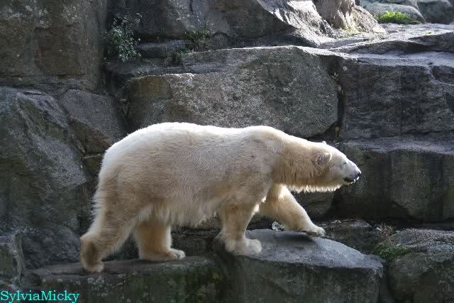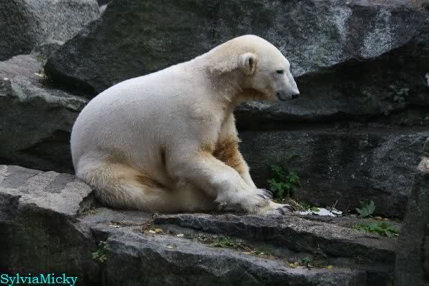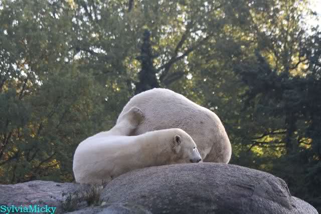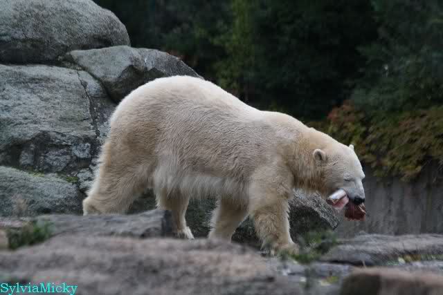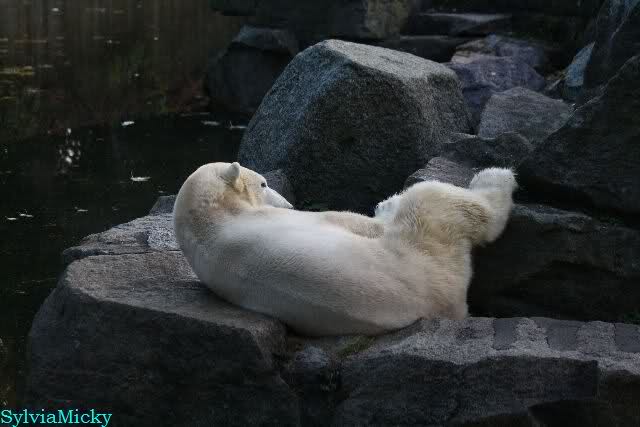 Good evening to you all Knut & Co. friends around the world at the end of Sunday here. Bad weather at afternoon. It was a short visit in Zoo for me. Polar bears in rain. No probs between the bears. Knut was sitting on his little place at the right side of the enclosure, looking what the bears were doing. Tosca and Kati were walking. And Nancy was sleeping behind the rocks.