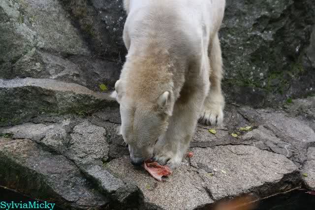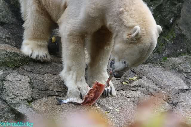Knut bekam heute reichlich zu essen. Ein Croissant, Fische, mehrere Stücke Fleisch, ein halbes Rosinenbrot und einen schönen großen Lachs.