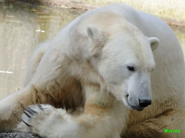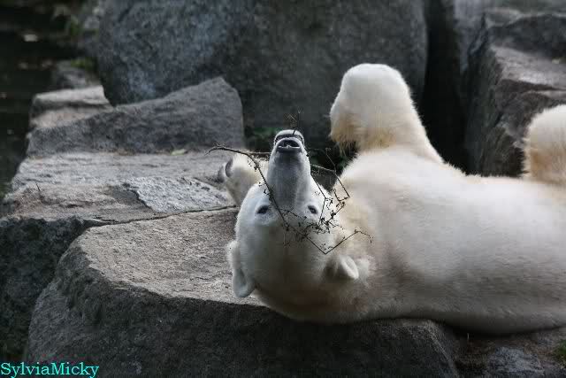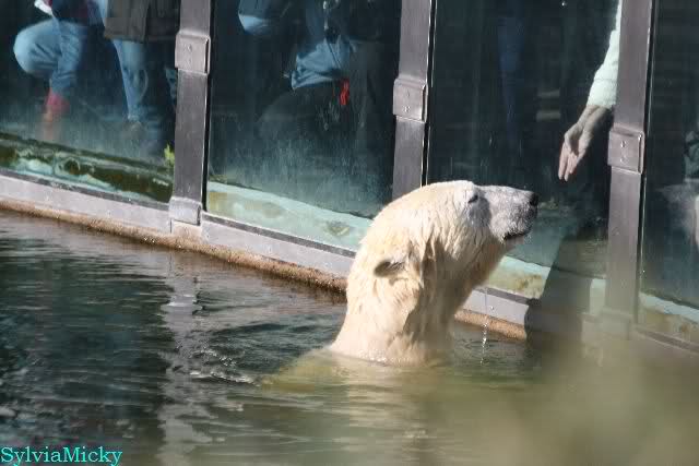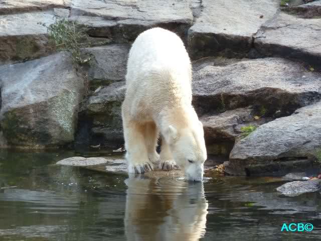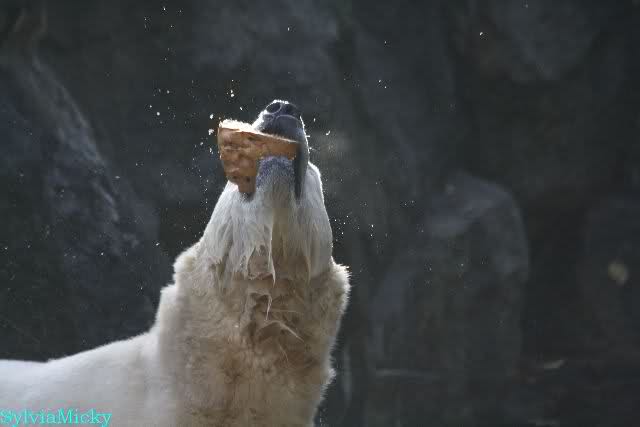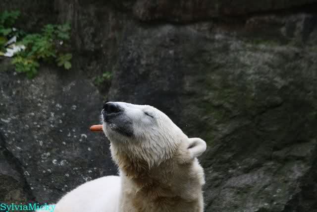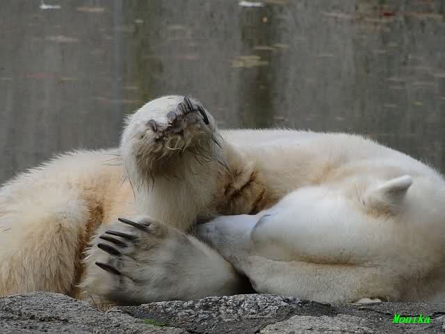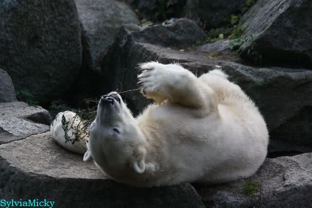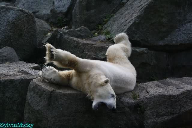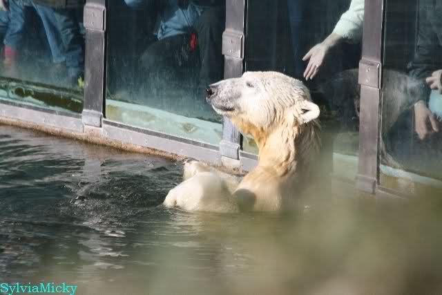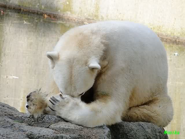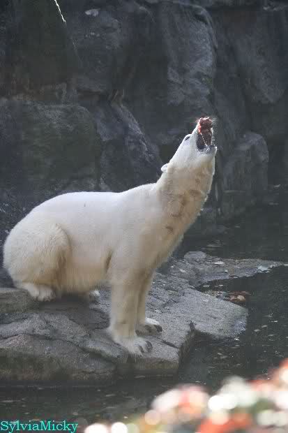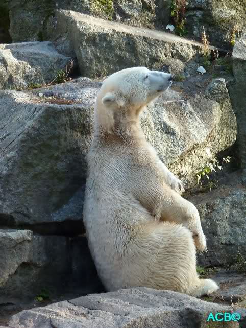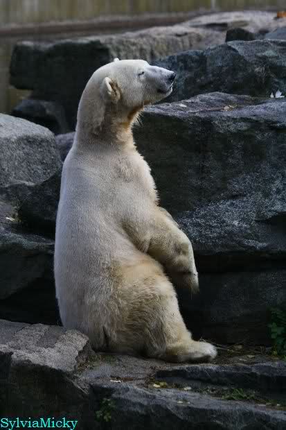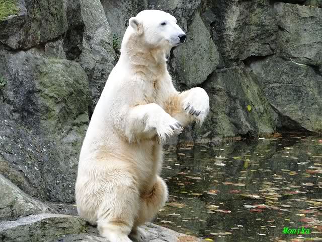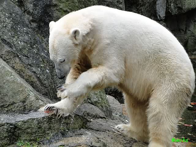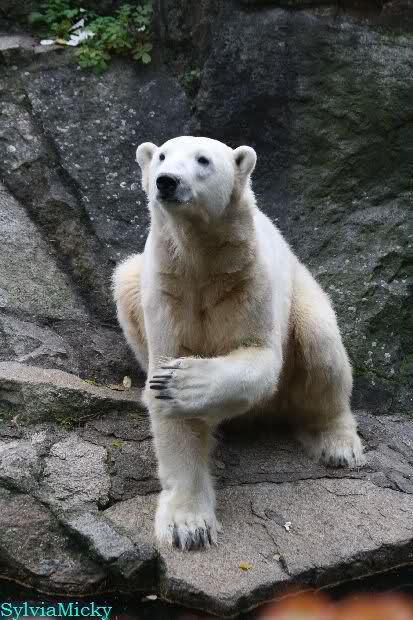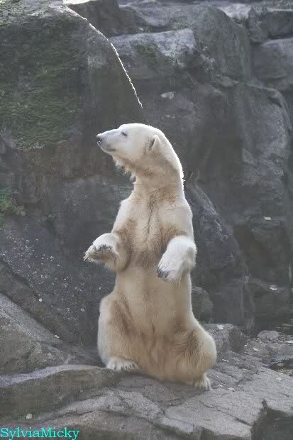 Nur mal so nebenbei: Es wird ja von Kritikern bemängelt, das Knut zu vermenschlicht ist und er stehend um Futter bettelt, bzw. danach winkt. Dieses Foto entstand 2007 bei den großen Eisbären im Berliner Zoo...