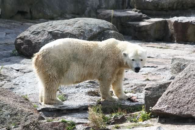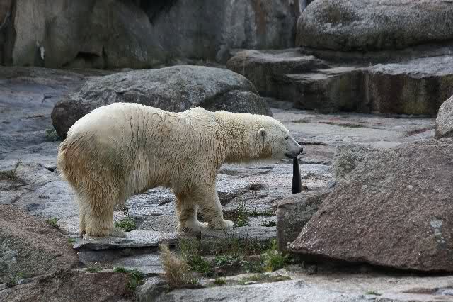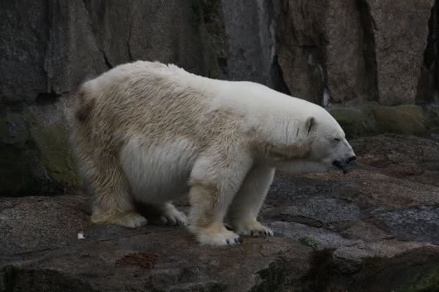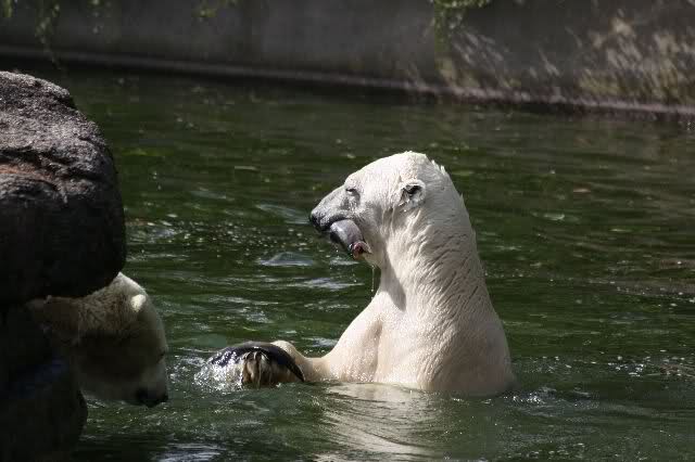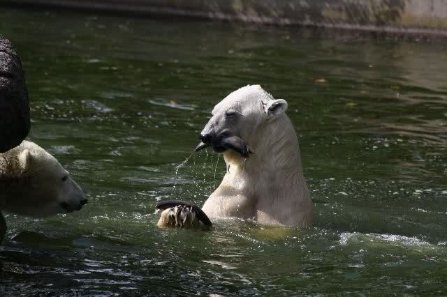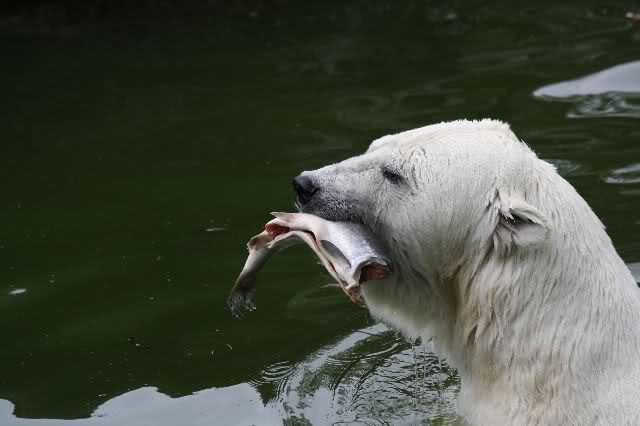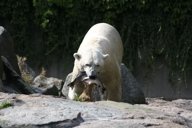 Heute Morgen bekamen die Eisbären auch wieder Lachs. Diesmal bekam auch Nancy einen. Es fütterte ein junger Pfleger, der seine Sache sehr gut macht.