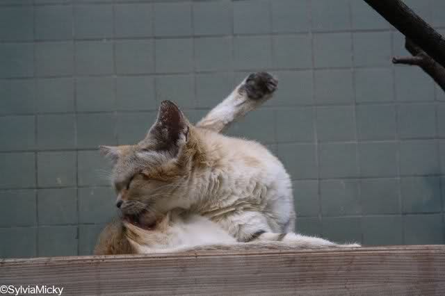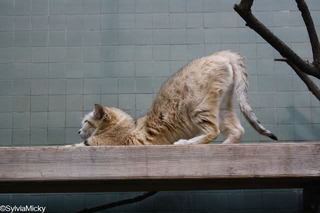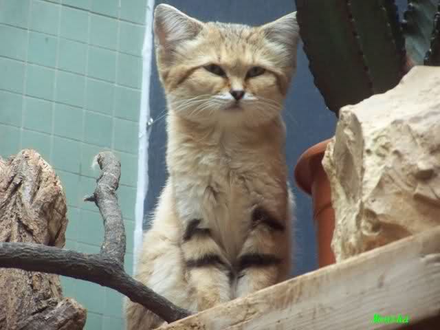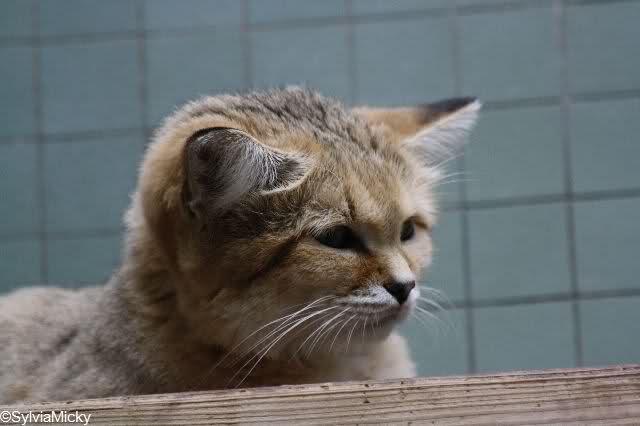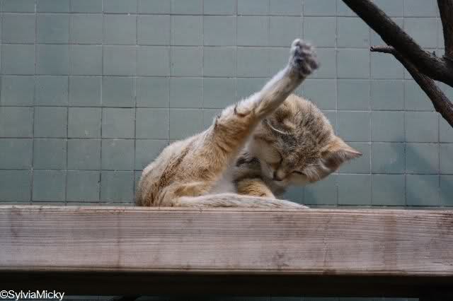 Eine sehr aufmerksame Sandkatze beim Säubern des Käfigs