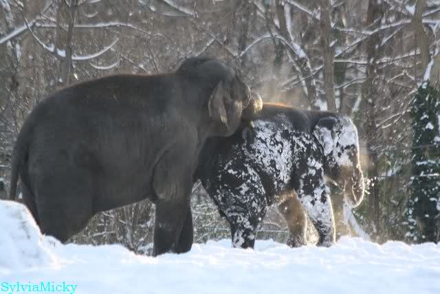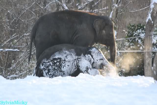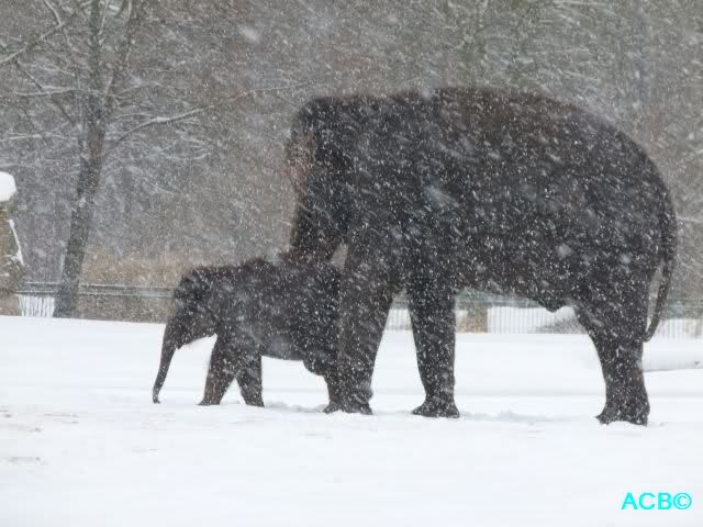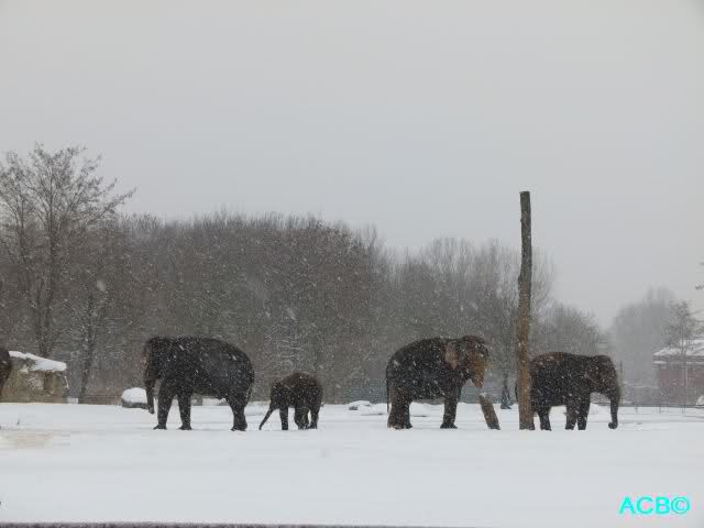 Während die Innenkäfige sauber gemacht wurden, hatten die asiatischen Elefanten Ausgang im Schneegestöber