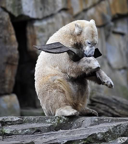 Als ich bei Knut eintraf, erfuhr ich, dass er in der Zwischenzeit gelegentlich mit den Besuchern Ball gespielt hatte, allerdings ohne rechte Begeisterung. Knut begeisterte gerade etwas anderes: Er hatte ein undefinierbares Stück Lederlappen beim Wickel, es sah aus wie ein Stück Schwarte oder ähnliches. Wir rätselten, was das sein könnte; so wirklich genau wollten wir es aber nicht wissen. Knut jedenfalls schien es zu gefallen und auch zu schmecken. Er biss einige Löcher hinein und verspeiste das Teil schließlich ganz. Wohl bekomm´s.