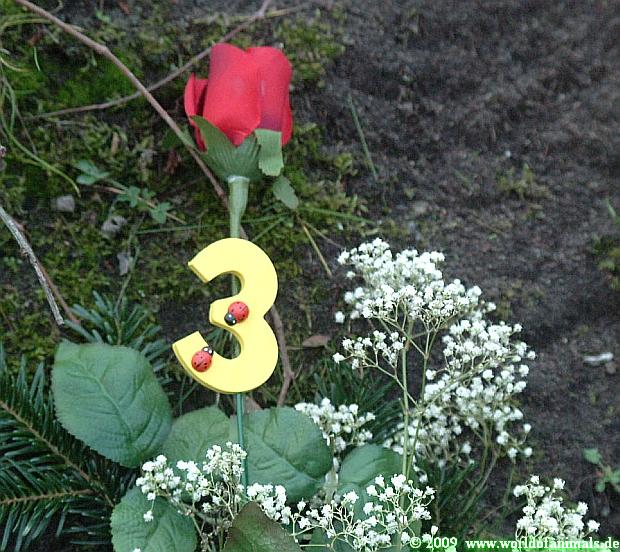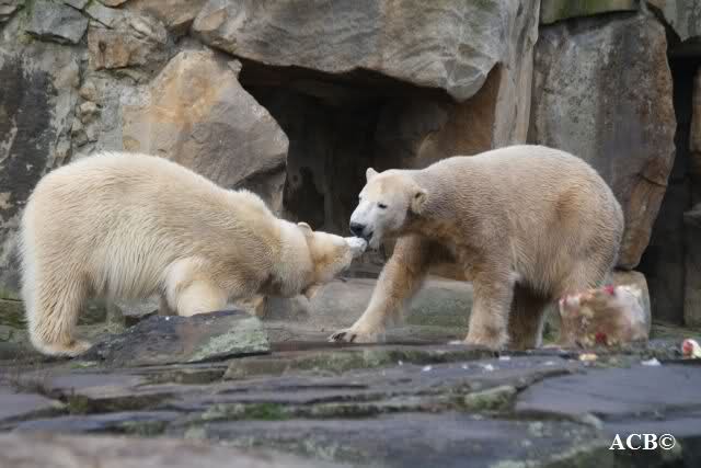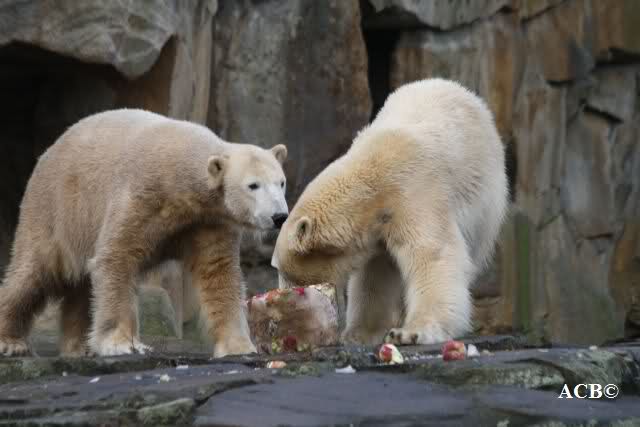 Um 11.00 Uhr wurde Knuts Geburtstagstisch gedeckt. Er bekam eine liebevoll dekorierte Eistorte, ein großes Brot als 3 geformt, einen großen Lachs und einen Jutesack. Gianna wurde für eine Stunde eingesperrt. Man hörte sie von draußen lautstark an die Tüe bummern. Sie wollte raus. Knut hatte 1 Stunde Zeit, um die Leckereien zu verspeisen. Als erstes fraß er das Brot und den Lachs. Dann ging es an die Eistorte. Nur die Eistorte braucht länger als 1 Stunde um aufzutauen. Gianna kam, und stürzte sich sofort auf die Torte. Es gab eine kurze Rangelei, und Knut überließ Gianna unfreiwillig die Torte.
