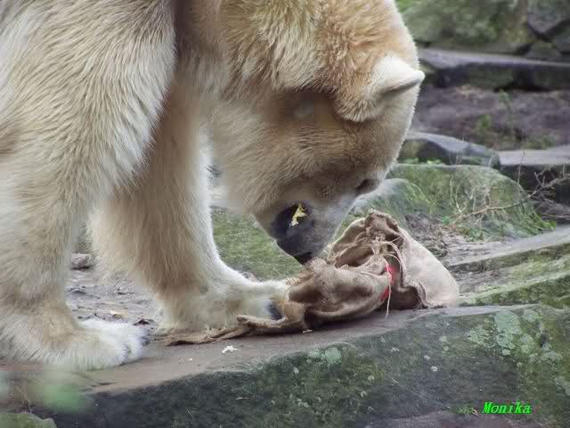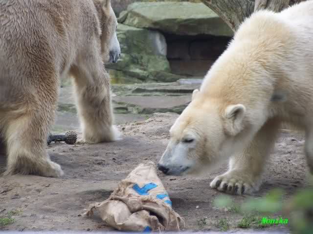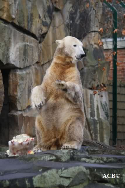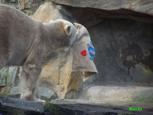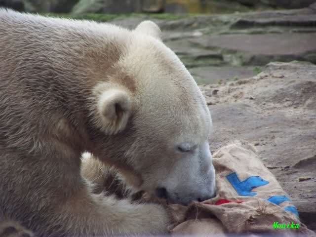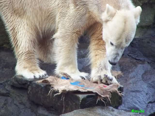 Good evening to you all Knut friends worldwide at the end of Knuts 3rd birthday. Please take a look to the pictures and watch Knut gifts. He got one hour time to eat the cake, to play with the new bag. After one hour Giovanna came out of her cave and did eat the rest of the cake, did play with Knuts new bag etc...
