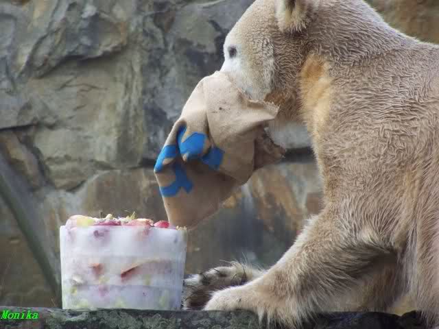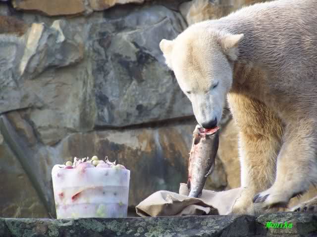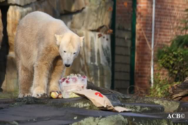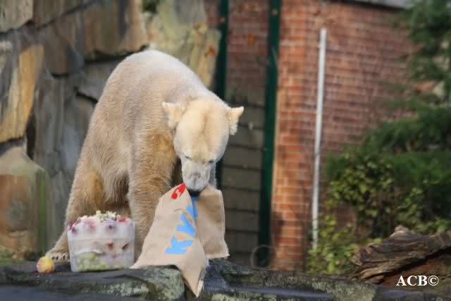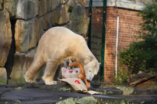 Knut bekam heute von seinen Pflegern eine Eistorte und von einer Knutfreundin einen, mit Leckerchen und einem Quietschspielzeug, gefüllten Jutesack.