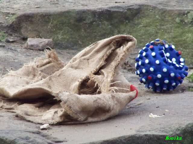 Denkste! Als wir wiederkamen, erzählten Besucher, die ausgeharrt hatten, dass Gianna sich schnell der Eistorte bemächtigt hätte. Sie hätte darauf herumgedroschen und das gute Stück in Einzelteile zerlegt. Außerdem hätte sie den schönen, neuen Jutesack in Nullkommanix aufgerissen, um an das Innenleben zu kommen. Die Hundeleckerli hätte sie aufgefuttert und den schönen Quietscheball in ein verbeultes Etwas verwandelt. Das ist eine Eisbärin!