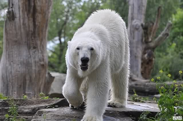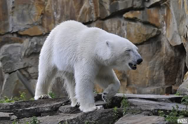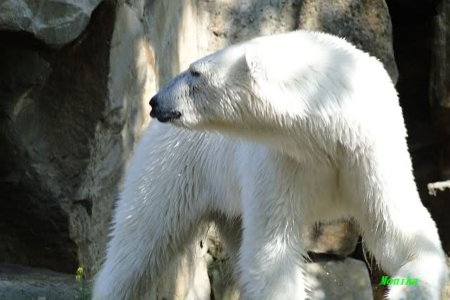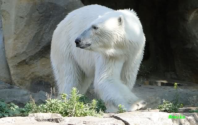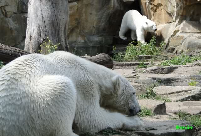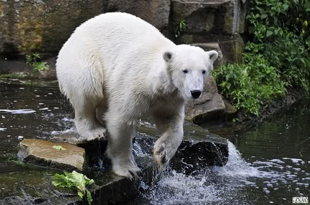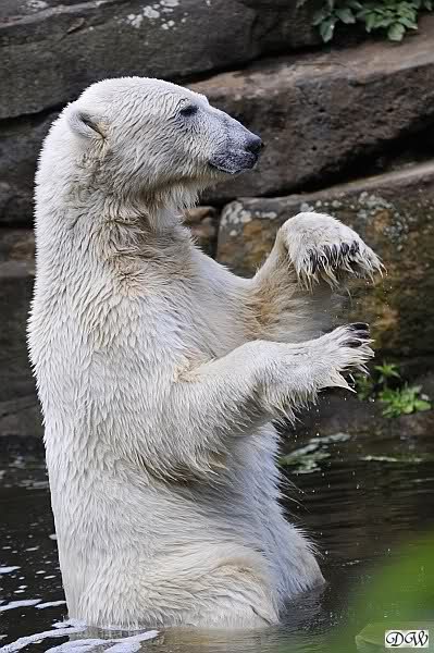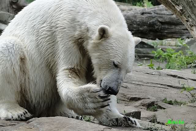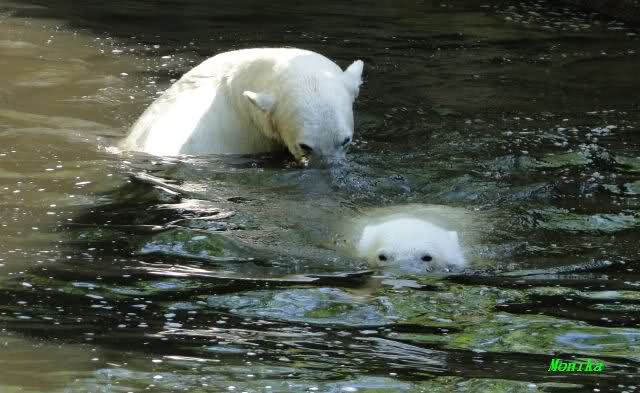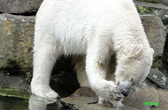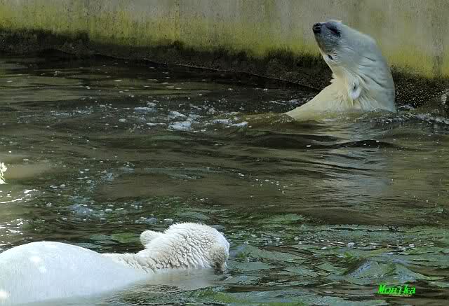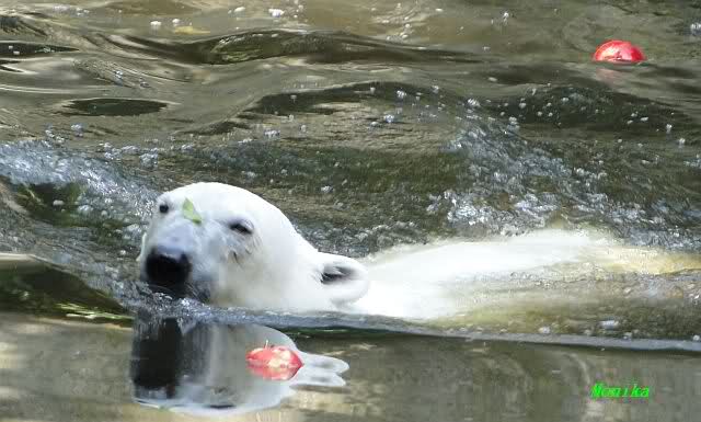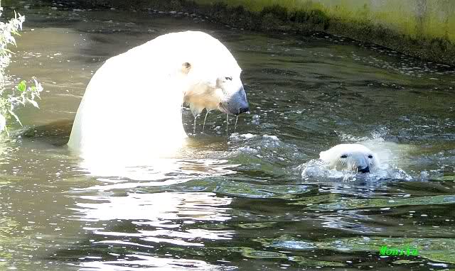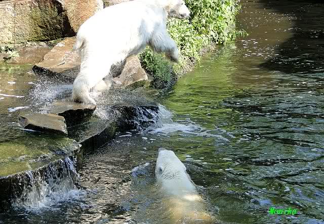 Gespielt haben heute wieder die großen Eisbären. Erst Nancy mit Tosca, dann ganz kurz alle drei und als Tosca ihren Zirkus-Gang einlegte, spielten Katjuscha und Nancy miteinander. Schön zu sehen, dass die Eisbärinnen nicht zu alt zum spielen sind. Tosca’s Ohren müssten eigentlich schon die Ohrenlänge eines Kaninchens haben. Gestern war das große Ohrenschlecken angesagt und heute halt die Spielerei im Wasser.