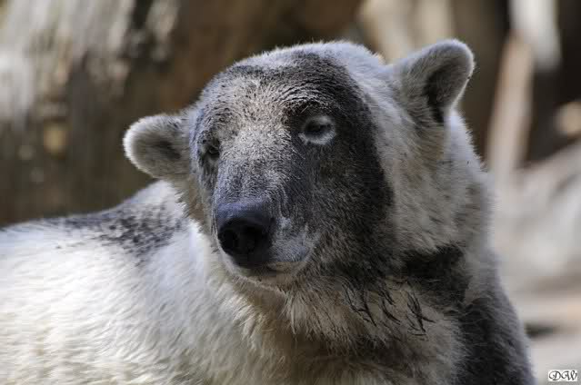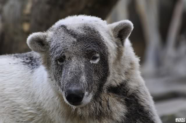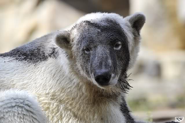 Knut besorgte sich in kurzer Zeit wieder einmal ein wunderschönes schwarz-weißes Muster. Jedenfalls genug um das Rätselraten einiger Besucher in Gang zu setzen. Weshalb ist Knut schwarz oder braun?