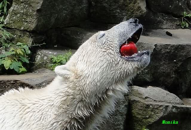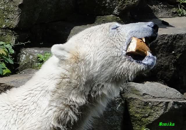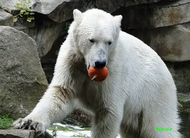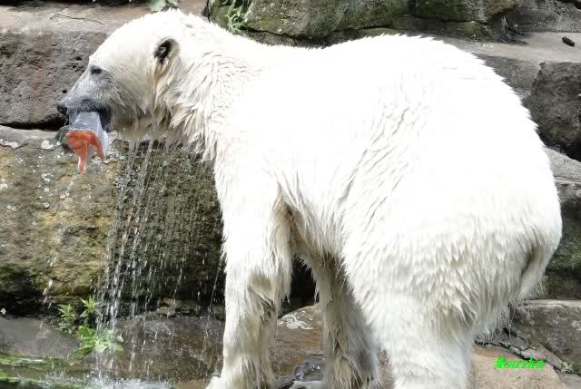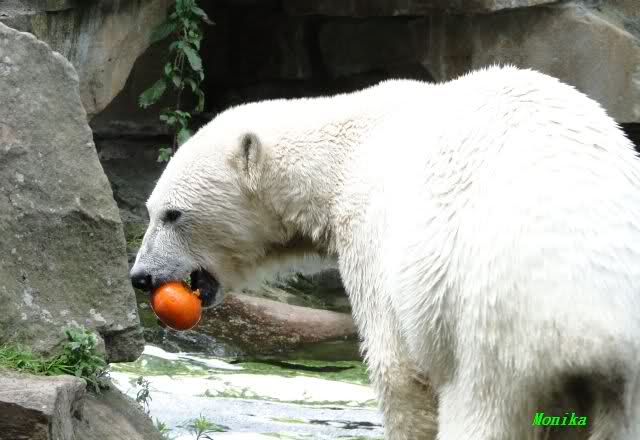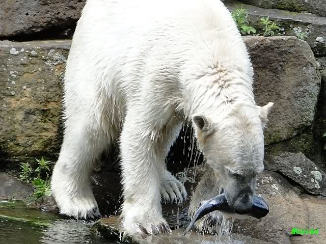 Heute bekam Knut von einer Hamburger Knutfreundin 2 große Lachsköpfe und ein großes Stück Lachs. Herr Röpke warf noch einen Lachskopf oben in den kleinen Pool. Den holte sich Knut auch noch. Das gab es auch noch nie, dass Knut den Lachskopf und den Kürbis ganz in Ruhe alleine verspeisen kann, ohne dass Gianna es ihm weg nahm.