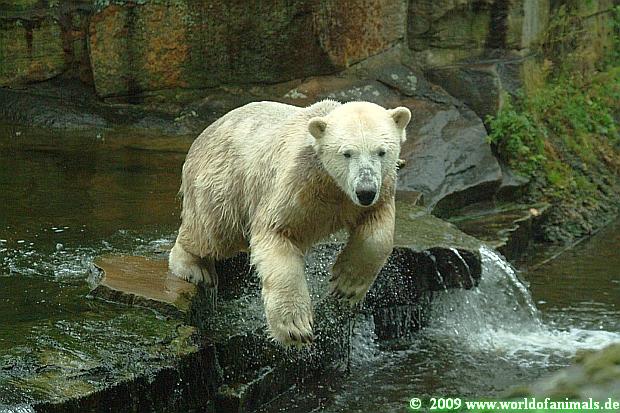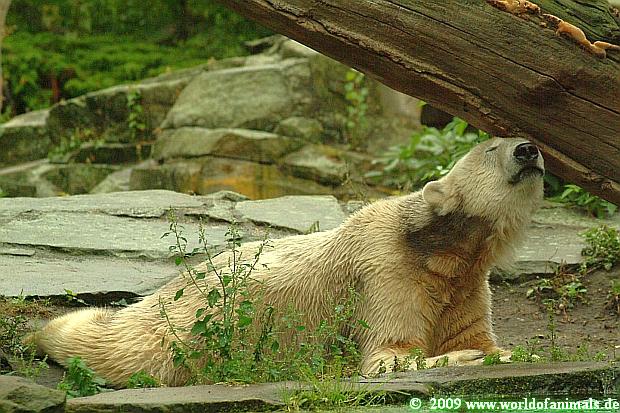 Heute morgen war der Zoo noch menschenleer. Knut lag unter seinem Baum, um sich dann ins Wasser zu begeben und ordentlich rumzutoben.