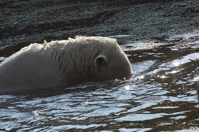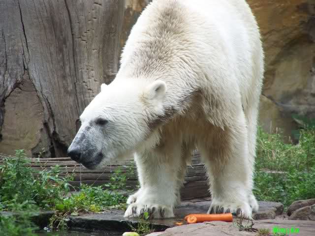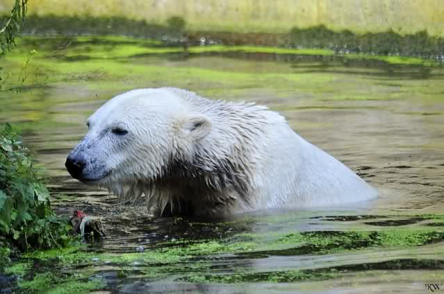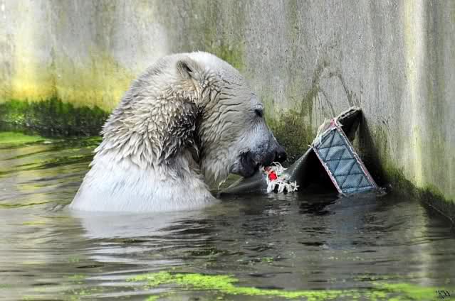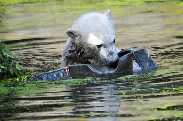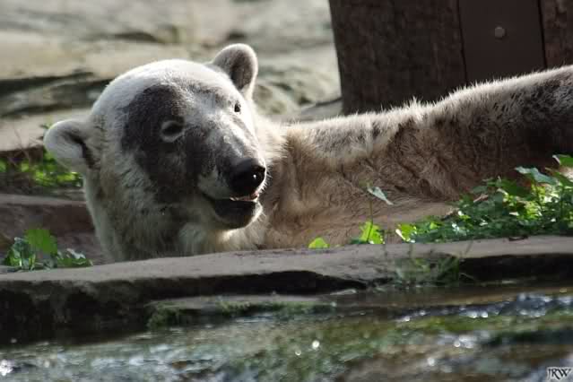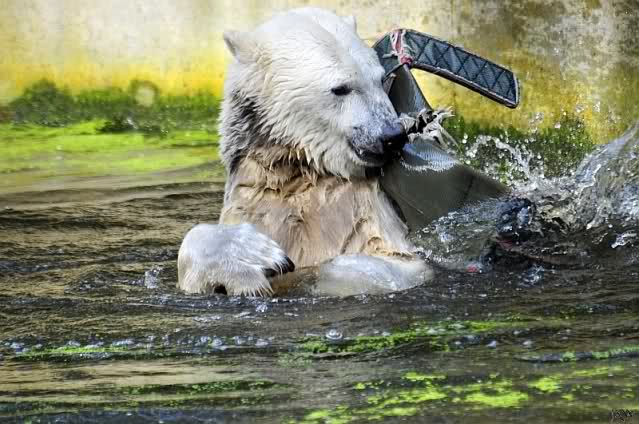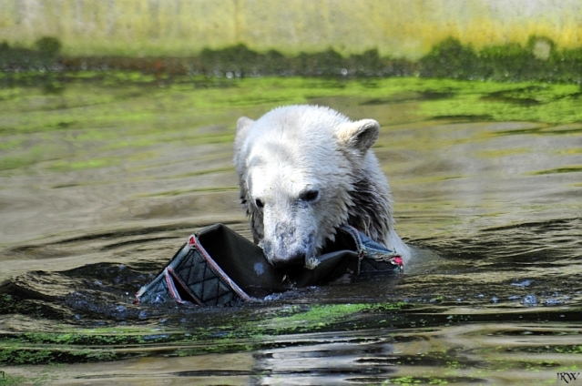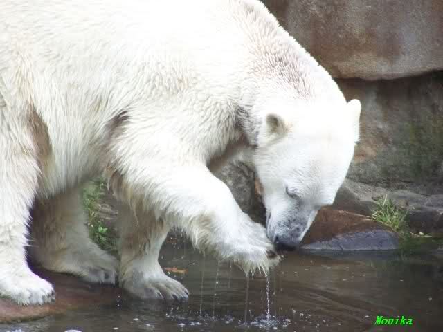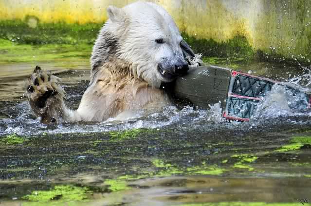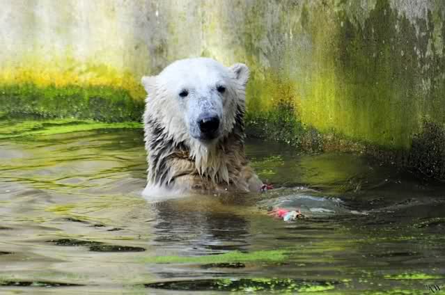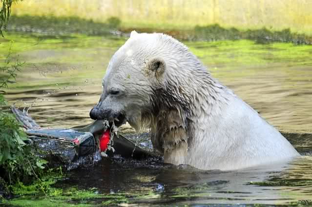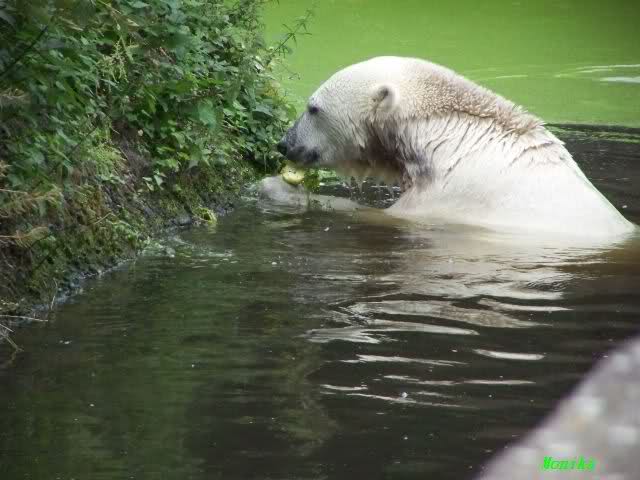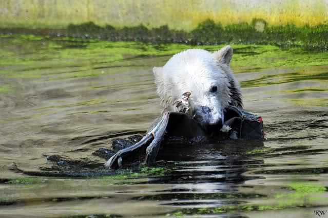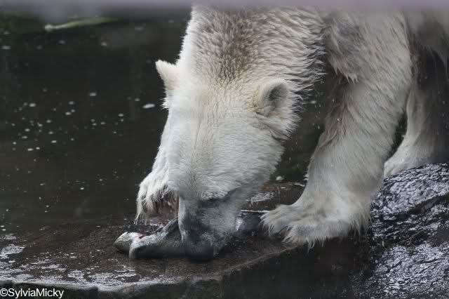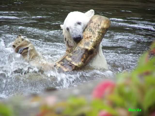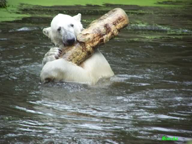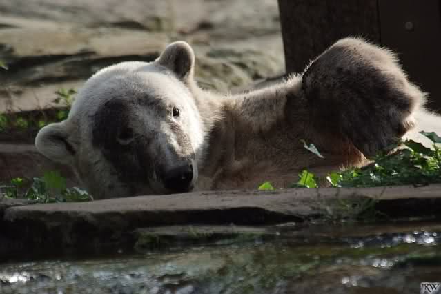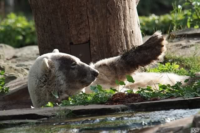 Knut ist heute so gegen 10.00 Uhr aufgestanden und spielte dann mit seinem Baumstamm im Wasser. Zum Mittagessen gab es heute neben das Übliche wieder den Mittwochs-Lachs und ein großes Weißbrot. Danach wurden wieder lange die Pfoten geleckt. Dann war schminken angesagt und anschließend ein Nachmittags-Schläfchen gehalten.