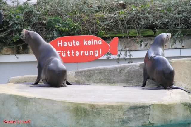 Als wir in Richtung Lars kamen schaute er schon aufmerksam in Richtung Eingang. Ob auch jeder eine entsprechende Gage mitgebracht hat. Das gehört sich ja wohl so. Aber je länger er schaute - es kam einfach kein Bittsteller. Um 11.00 Uhr hatte das Warten aber ein Ende. Nesumi und ich machten uns an den steilen Berg zur Audienzhalle zu ersteigen. Nesumi hatte ganz schön an der Adventsgage zu schleppen. Aber zuerst hören wir nur ganz lautes Schimpfen aus dem Becken der Seelöwen. Was war da passiert ? Als wir näher kamen sahen wir das große Debakel. Cosima und Barbara konnten sich garnicht beruhigen.