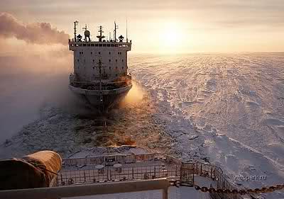Ihre Fotos aufgenommen an Bord des Eisbrechers „Vaigach“ zeigen „was es heißt einer Karawane von Schiffen in den nördlichen Meeren zu folgen, die von einem riesigen atombetriebenen Tankschiff angeführt wird.“