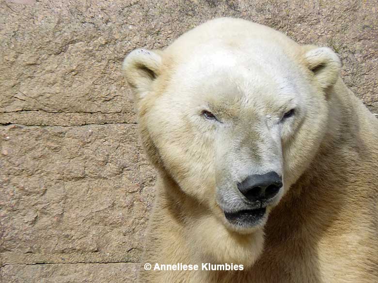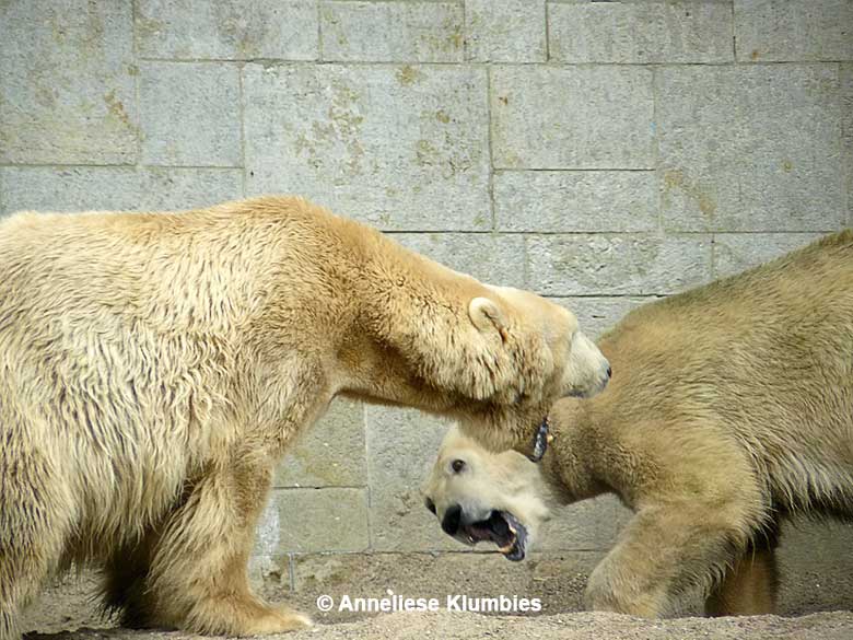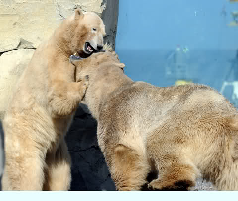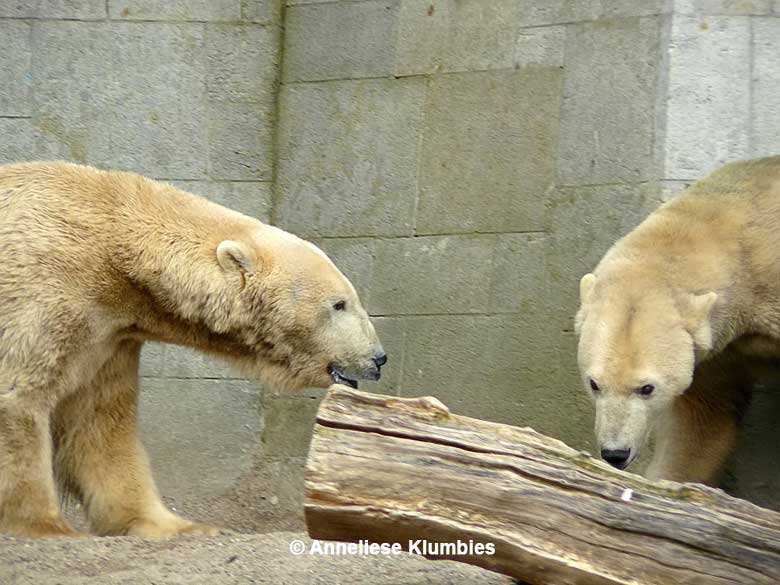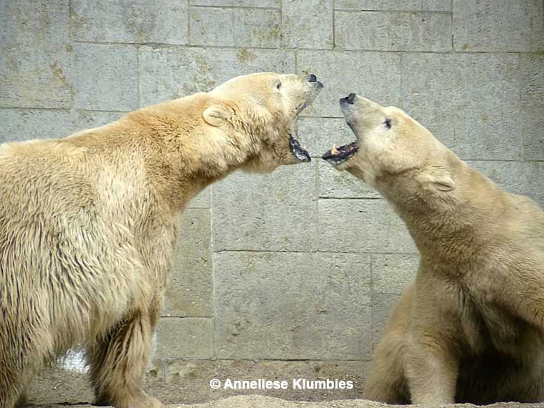 Auch Vienna und Vilma sind ausgesprochen schöne Eisbärinnen. Sie vertreiben sich die Zeit mit anregendem Streit um das Futter und um die interessantesten Plätze im Gehege. Sie tun sich nicht wirklich etwas.