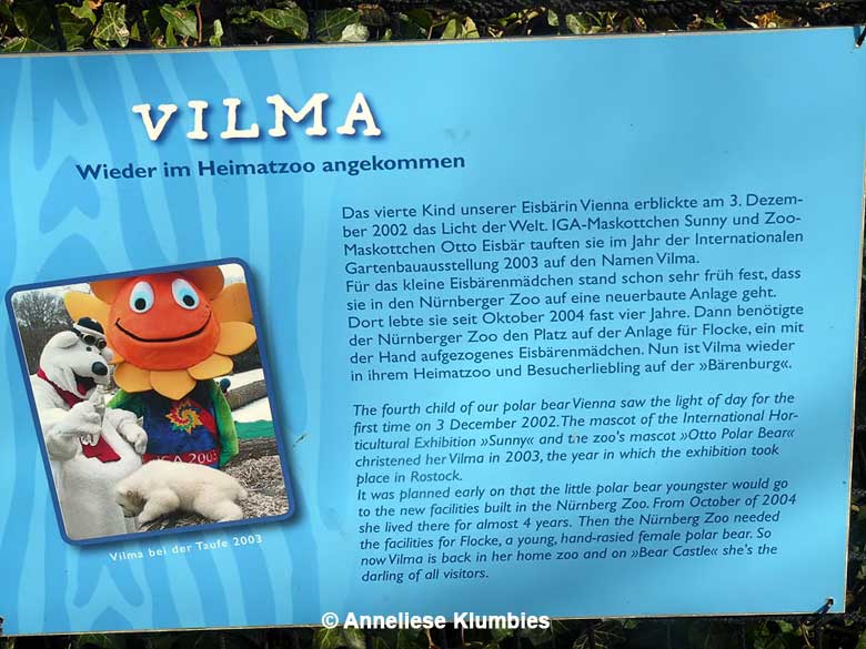 Vilma ist die Tochter von Vienna. Im Alter von zwei Jahren kam sie nach Nürnberg, um dort nach 4 Jahren wieder Platz machen zu müssen für Flocke. Als Vilma nach Rostock zurückkehrte, erkannte die Mutter sie nicht wieder. Sie begriff ihre Tochter Vilma als Konkurrentin um Futter und Revier und wies ihr mit aufgerissenem Rachen, und bei Bedarf mit Gebrüll, ihren Platz zu.