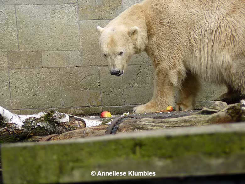 Vilma lagerte draußen und Vienna, ihre Mutter, steckte ab und an ihren Kopf aus dem Gehegeeingang auf der Suche nach Sensationen oder besser noch nach Futter. Der majestätisch anmutende Eisbärenmann Churchill lümmelte sich getrennt von ihnen im benachbarten Mutter-Kind-Gehege und dämmerte in der Sonne. Dann wurde es lebendig, denn von oben regnete es Äpfel.