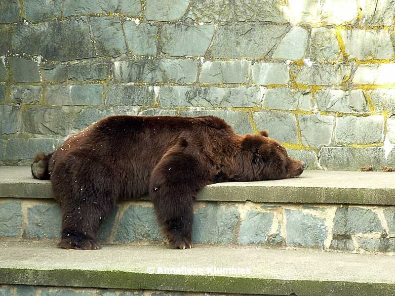 Am 13. März war Eisbärenwetter und das Wasser im Graben noch gefroren. Die beiden Kodiakbären hielten sich zwecks Winterschlummer im Inneren des Geheges auf. Beim zweiten Besuch konnte ich einen der Kodiakbären erblicken, der verschlafen und dekorativ in die Sonne blinzelte.
