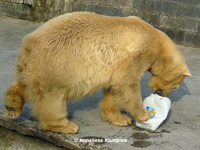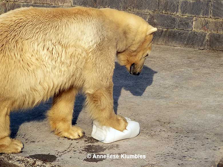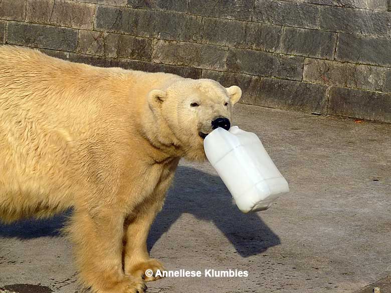 Es waren noch Eisschollen auf dem Wasser und sie hatte wohl Befürchtungen, sich zu stoßen. Wahrscheinlich weiß sie entgegen den Annahmen der Tierpfleger sehr wohl, welche Konsistenz Eis hat und welche Gefahren damit verbunden sind. Vienna war's recht; sie holte sich auch den zweiten Kanister inklusive Hering.