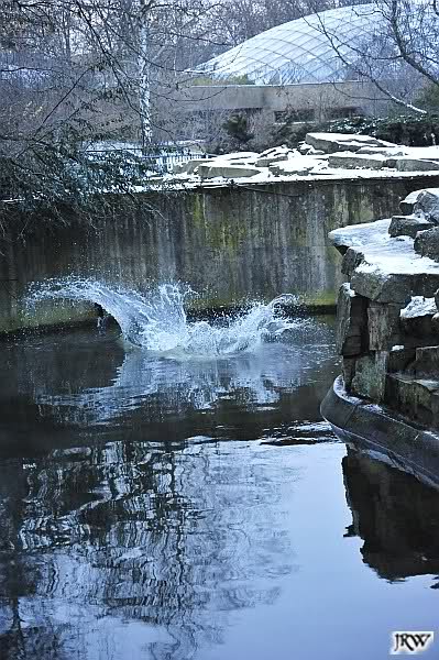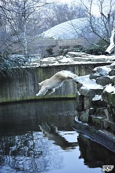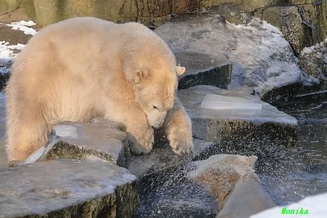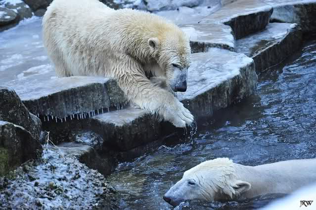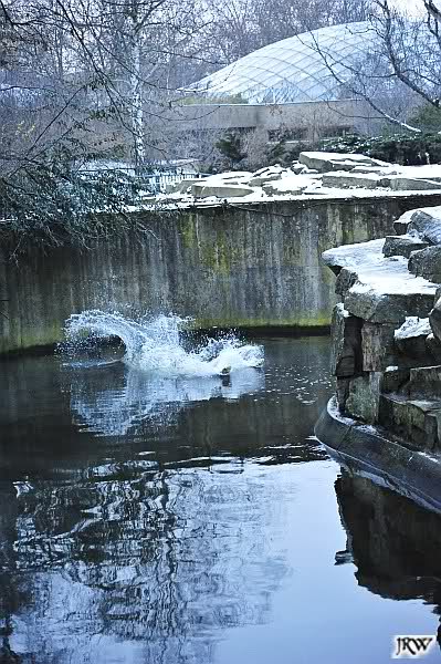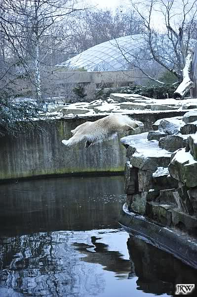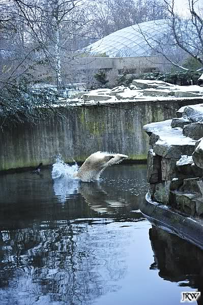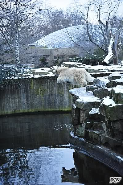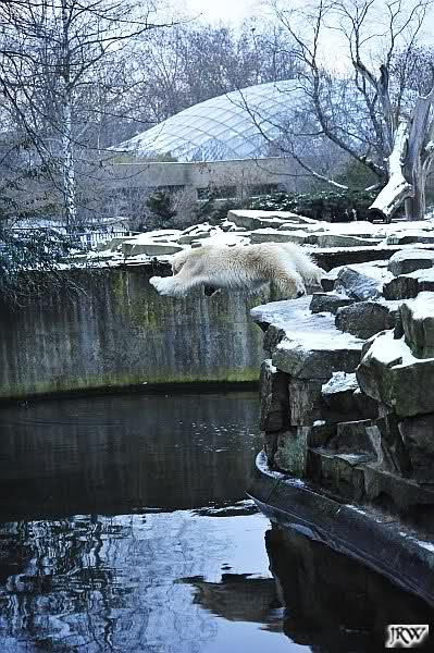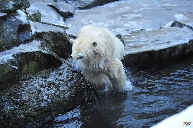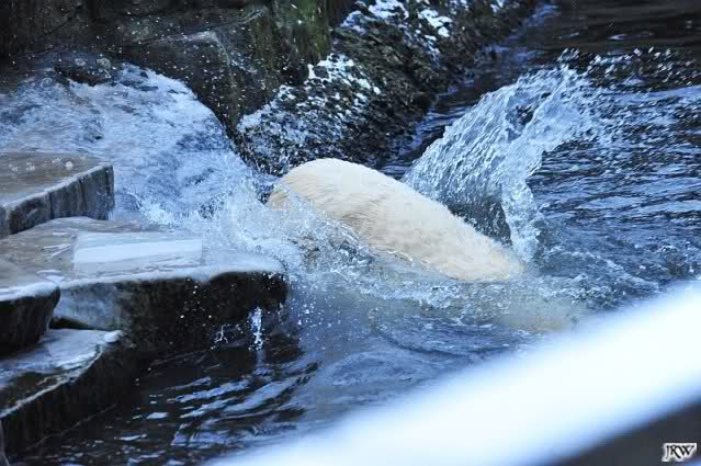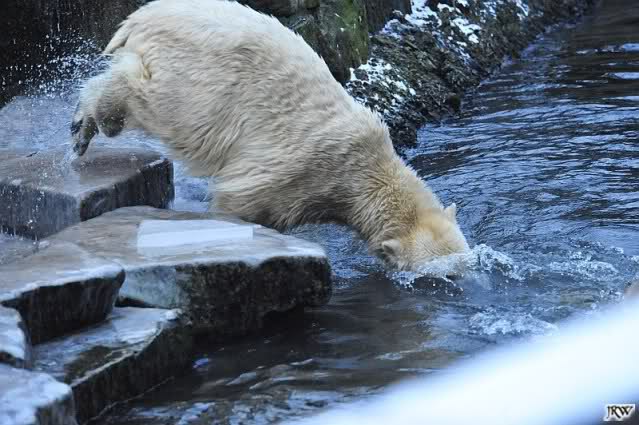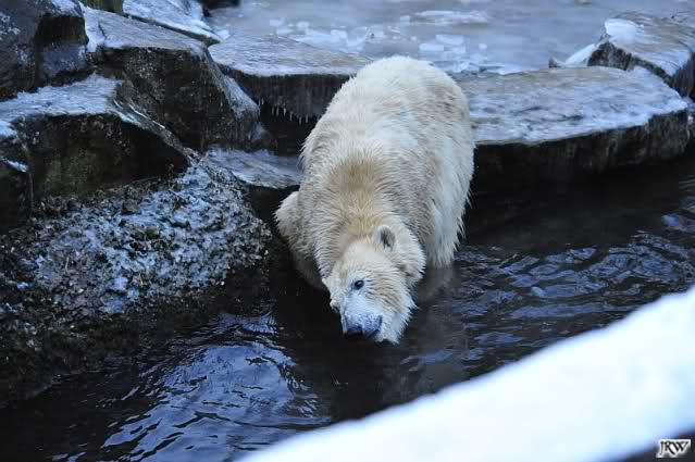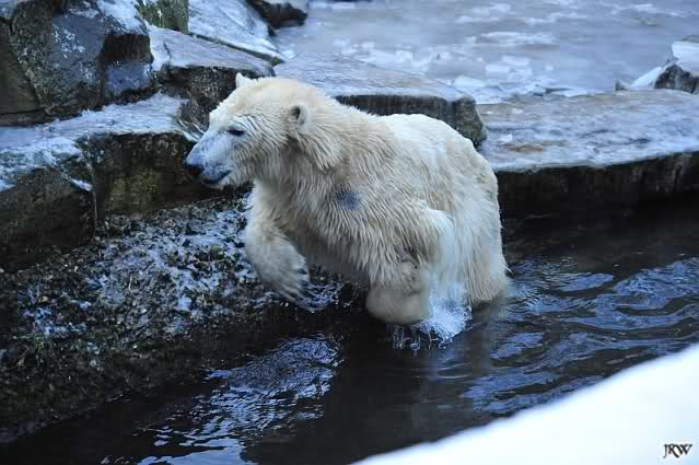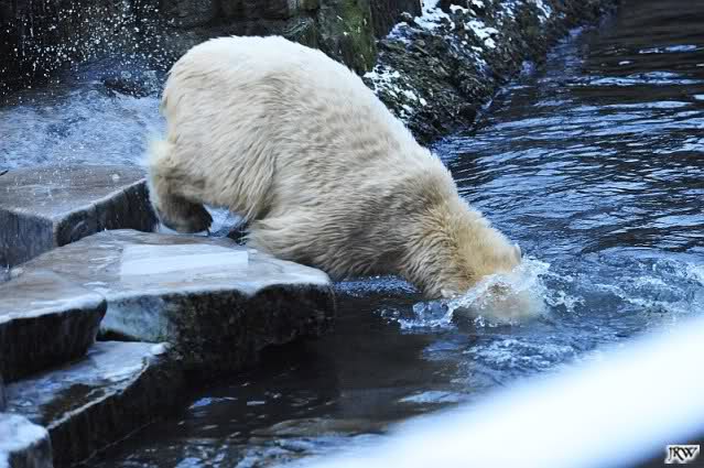 Dafür war bei Knut und Gianna etwas los. Zum einen waren schon etliche Besucher da, sowohl Stammbesucher als auch Touristen. Zum anderen waren die beiden jungen Bären sehr gut in Form. Als ich ankam, war Knut gerade im Wasser. Gianna wanderte auf der Anlage herum, kletterte die Felsen hinauf und hinunter. Die Steine waren ja ziemlich vereist und so hatte Gianna zu tun, aber sie schaffte es. Kein Wunder bei ihren Pelzsohlen.