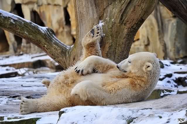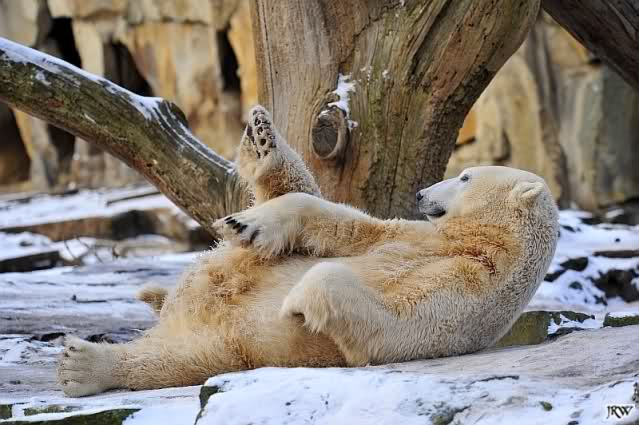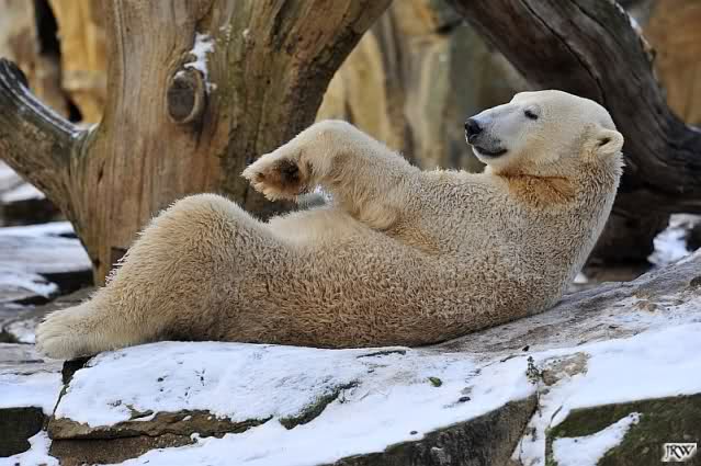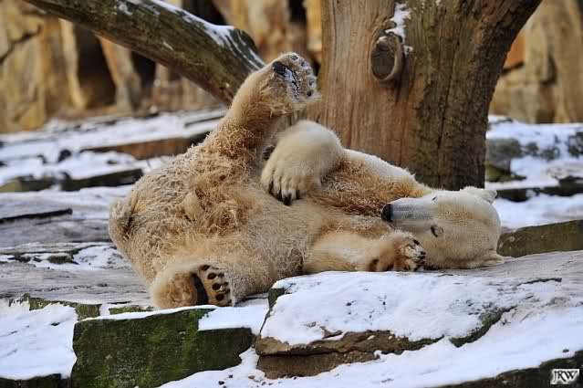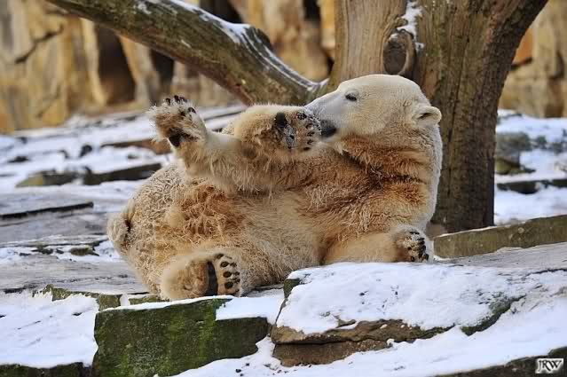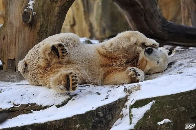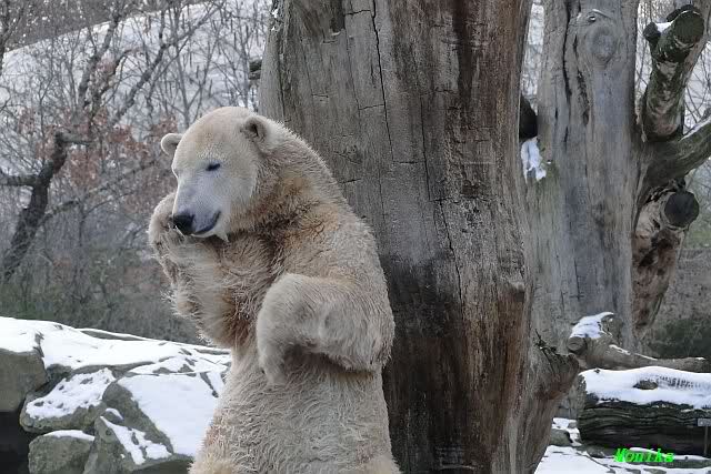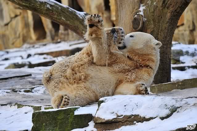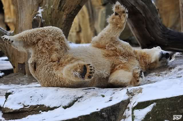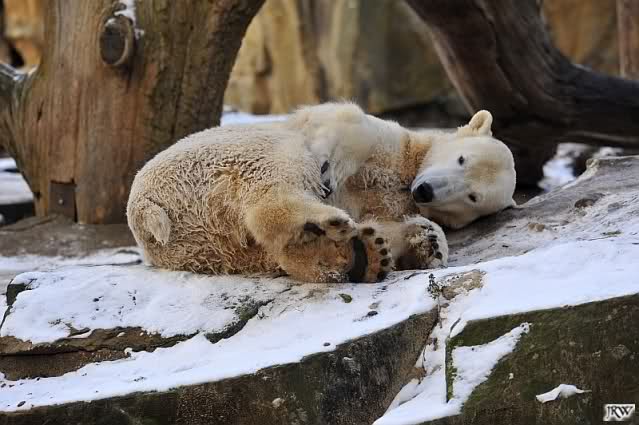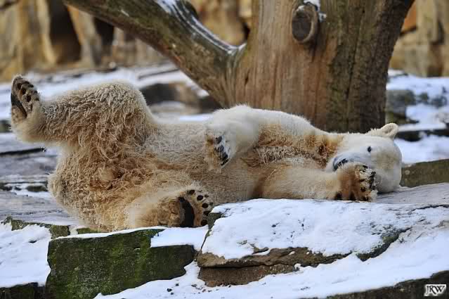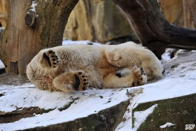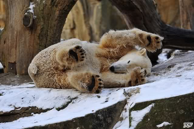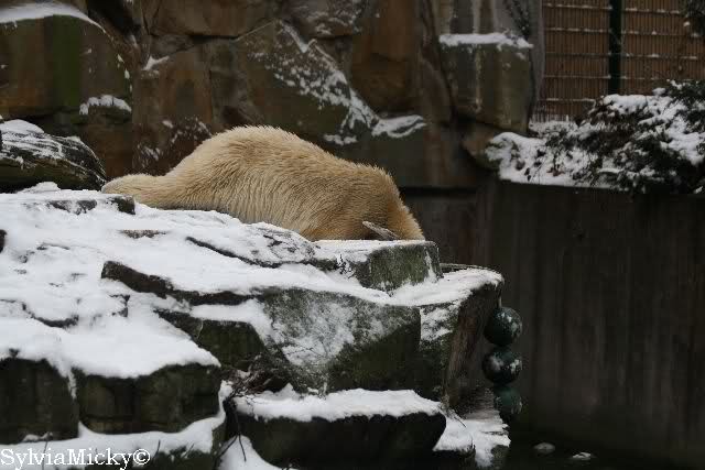 Dann wurde gebalgt und auf Eisbärenart geschmust. Aber nicht zu lange. Dann ging Knut zu seiner Kuhle und aalte sich dort lange und genüsslich im Schnee.