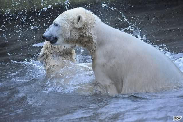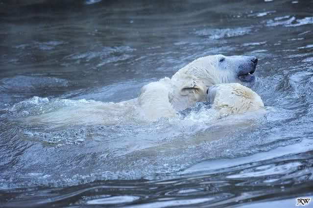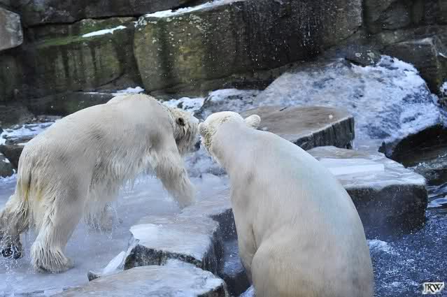 Besuch bei Gianna und Knut am Sonntag Nachmittag. Aber was für einer. Wir fanden zwei entfesselt spielende Bären vor. Sie tobten im Wasser wie wir sie nie zuvor gesehen haben, trotz der späten Stunde. Ob unten am „Tisch“, links im Graben oder rechts. Es spielte keine Rolle. Mal tauchte Knut Gianna unter, mal sie ihn. Es gab keine lange Pause. Es wurde so gespielt, dass Dampf von ihrem Atem aufstieg. Je später es wurde, desto wilder und freudiger spielten sie. So eisig wie die Bilder aussehen, so war es auch. Inzwischen war ein starker Wind aufgekommen und die gebannt zuschauenden Besucher froren. Nicht aber die Bären. Sie tobten was das Zeug hielt. Als wir gegen 16.00 Uhr gingen, war immer noch High Life im Wasser. Knut und Gianna spielen mittlerweile so befreit miteinander, dass man atemlos zusieht. Einfach wunderschön. Wenn man die beiden Youngster so sieht, vergisst man alles andere.