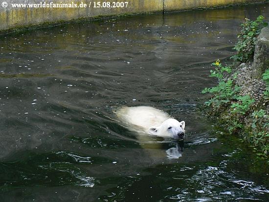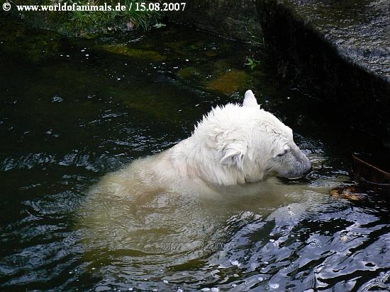 Da hab ich aber auch erleichtert aufgeatmet, als ich durch Deinen wieder so knutnahen Bericht erfuhr, dass der kleine Bär nun Spielzeug hat, lieber Harmuth. Mir bereitet der Gedanke an eingeschlossene Tiere eh immer ein bisserl Probleme, obwohl ich natürlich auch weiss, welch grosse Dienste die Zoos erweisen. Dennoch ist es sehr gut zu wissen, dass Knut sich nun mit etwas beschäftigen kann! Sicherlich wird man sich an Land auch noch etwas für ihn einfallen lassen. Herzlichen Dank für diese herrlichen Wasserbilder!