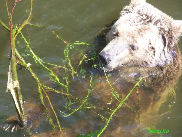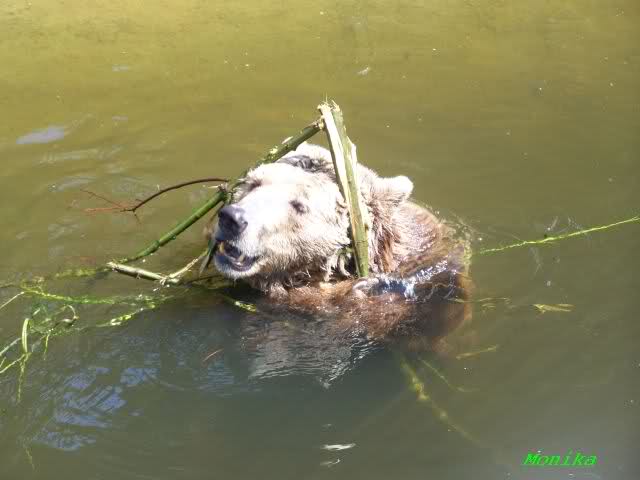 Einer der Braunbären genoss heute das Bad im Wasser mit einem Zweig.