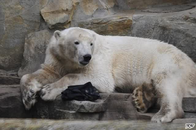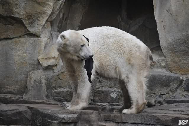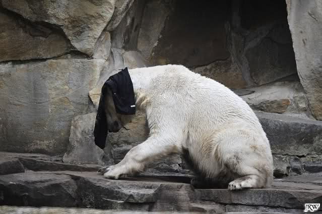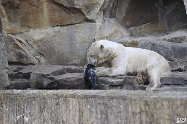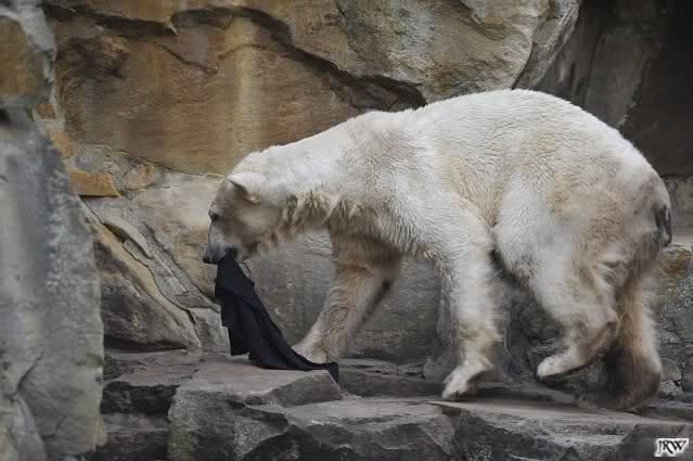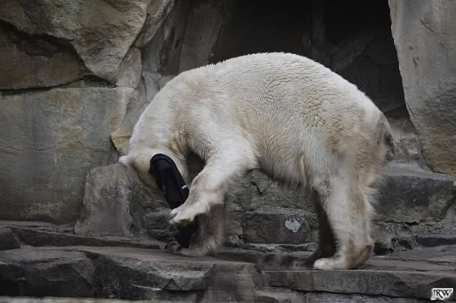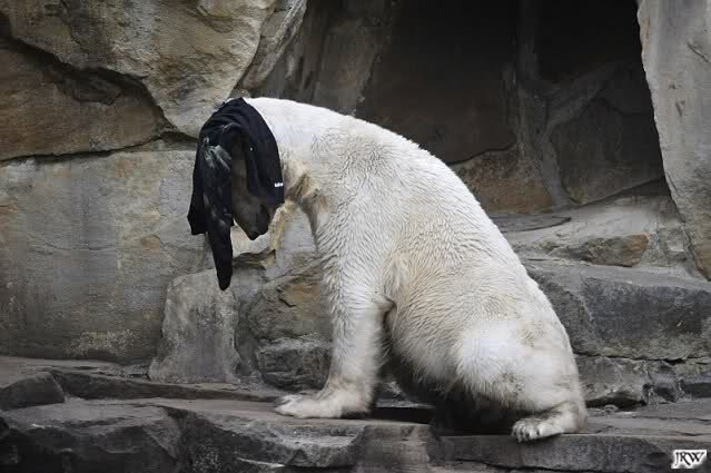 Nach der Abendfütterung kam Knut wieder heraus und brachte etwas mit. Ein Nashorn-T-Shirt!! Wie so oft, spielte er ruhig und zufrieden vor sich hin und sah hinreißend aus dabei.