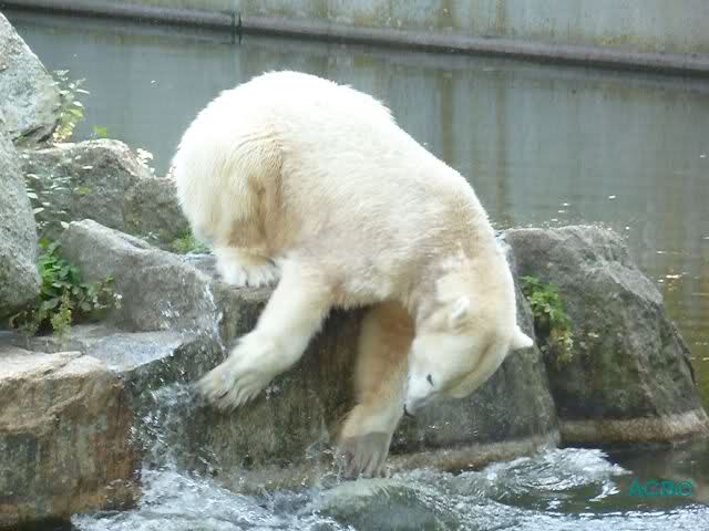 Es ist nicht zu fassen, was Menschen anstellen, wenn sie wollen, dass ein Eisbär zu ihnen herschaut. “Knuti, Knuti”, ruft eine ältere Dame – so, als ob das Raubtier ihr Kind wäre. Andere führen eine Art Fruchtbarkeitstanz auf, um Knut zu einem kurzen Aufblicken zu bewegen. Doch der denkt nicht daran, liegt mit dem Rücken zum Publikum auf einem Felsen und lässt lediglich seine Tatze locker hin und her schaukeln.