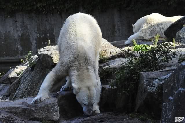 Heute Morgen lag Knut vorne auf dem Felsvorsprung und Tosca lief ihren Gang, zwei Schritte vor und zwei zurück. Nach kurzer Zeit startete sie den ersten Annäherungsversuch, wurde aber gleich wieder angebrummt. Tosca lief heute langsam zu Knut; hatte aber auch keinen Erfolg. Das wiederholte sie einige Male.