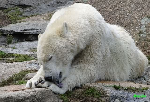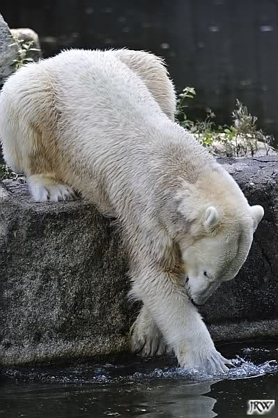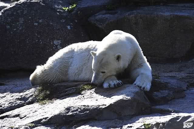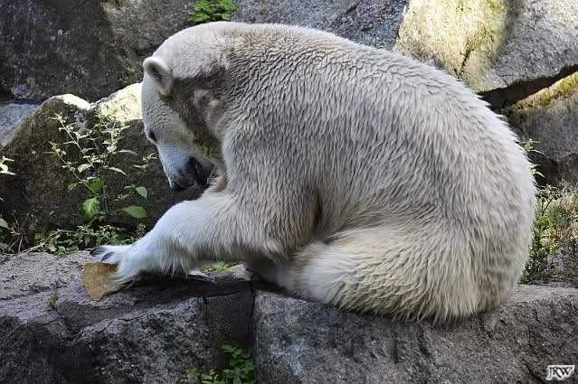 Knut sah vom Felsen aus, wie Tosca das ganze Futter holte, da tat er mir unendlich leid. Hat er doch gerade erst vor wenigen Tagen Freude daran gefunden, die Lars`Insel für sich zu entdecken. Und nun? Wo ist sein Futterplatz? Ich glaube, Knut versteht die Welt nicht mehr. er war auch heute nicht im Wasser. Ich mag gar nicht daran denken, wie es sein wird, wenn Nancy und Katjuscha noch dazu kommen, tritt er dann in den Hungerstreik? Hoffentlich findet er bald wieder seine innere Ruhe.