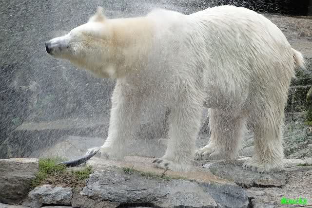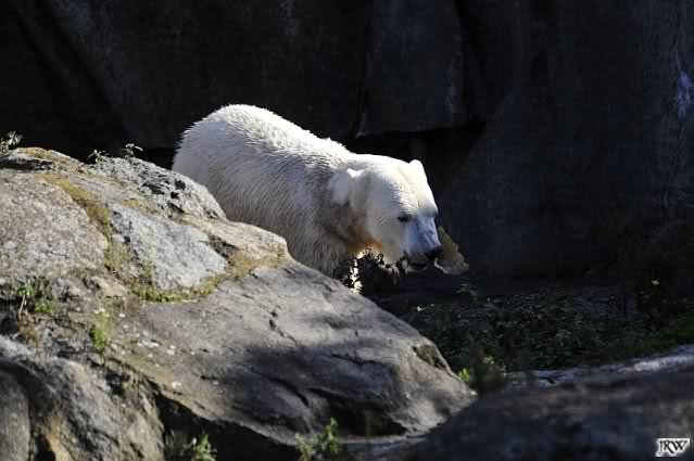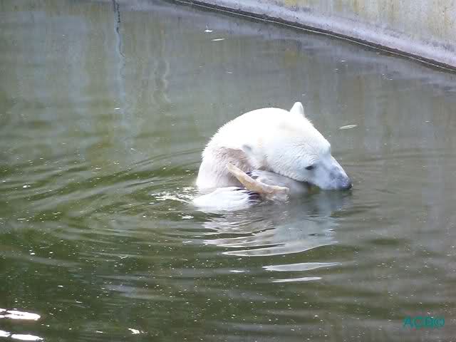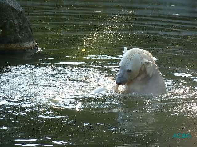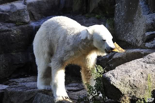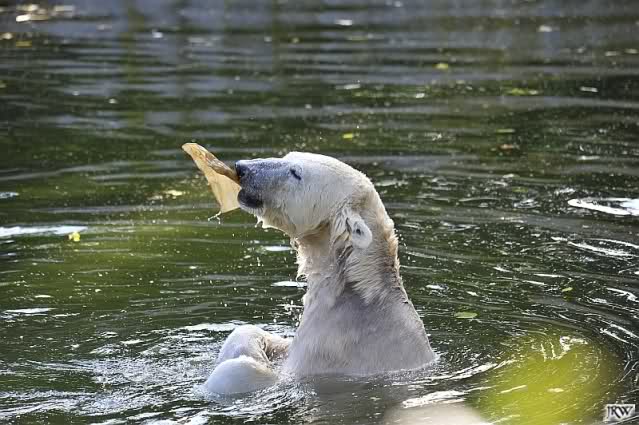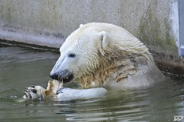 Als Frl. Weckert mit dem Futter kam, stand Knut vorne, aber als Tosca dann ins Wasser hechtete, lief Knut gleich weg. Fr. Weckert rief Knut, aber der war erstmal nicht zu sehen. Derweil tauchte Tosca mit einem Fisch und ein Stück Fleisch in der Schnauze auf. Da das meiste Futter im Wasser landete, ging Knut heute ziemlich leer aus. Er fraß einen Fisch und 2 Stückchen Fleisch. Während Tosca sich heute bestimmt wie im Schlaraffenland vorkam, holte sich Knut nach und nach die Brötchen, die auf der Anlage lagen. Tosca tauchte immer wieder ab und holte ein Fisch nach dem anderen heraus. Es waren auch noch einige Stücke Fleisch dabei.