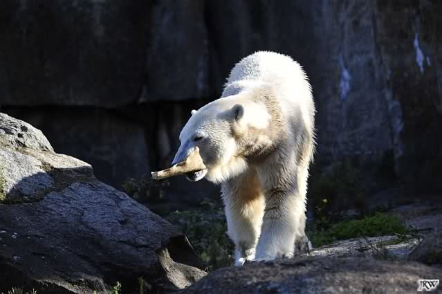 Als wir zu Knut und Tosca kamen, lag sie auf einer Seite und er auf der anderen. Es dauerte nicht lange und er machte sich auf die Suche nach etwas. Und siehe da, er fand ein Stück eines Kauknochens, es war schon flach, aber wieder hart. Knut hatte eine wunderbare Zeit damit. Endlich etwas, das im Moment nur ihm gehörte. Er spielte fröhlich vor sich hin und schwupps, das Ding fiel ins Wasser. Knut ruderte und ruderte von seinem Felsen, aber gemeiner Weise kam der Knochen nicht zurück. Also musste Knut tatsächlich ins Wasser. Er fand sein Spielzeug sofort und dann drehte er auf. Er zeigte es nach allen Seiten, kuschelte damit und dann ging es zur Scheibe wo er den begeisterten Besuchern zeigte, was man alles mit so einem Stück machen kann. Es wurde auf den Kopf gelegt, an die Wange gedrückt, in die Luft geschleudert und vieles mehr. Hier spielte ein glücklicher kleiner Bär und ich bin sicher, dass den meisten Stammbesuchern neben dem Lächeln ein kleiner Kloß in Hals saß.