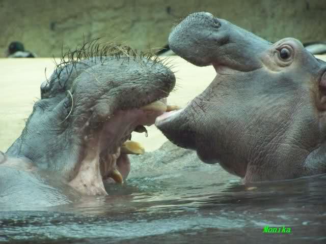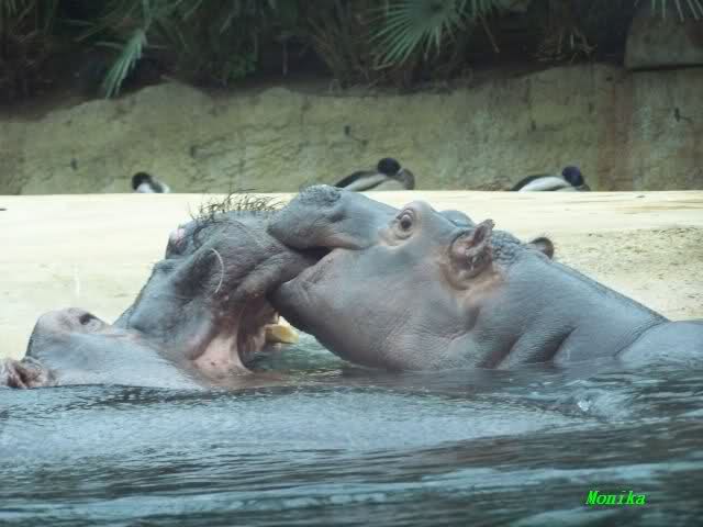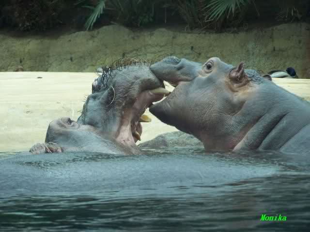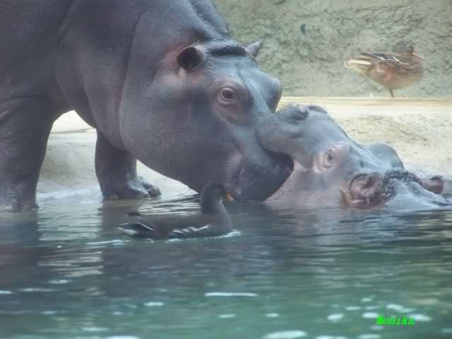 Die beiden kleinen Flußpferde sind kräftig gewachsen. Die Mutter hat ihre Kleinen "zum fressen" gern.