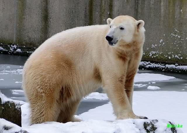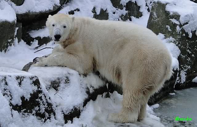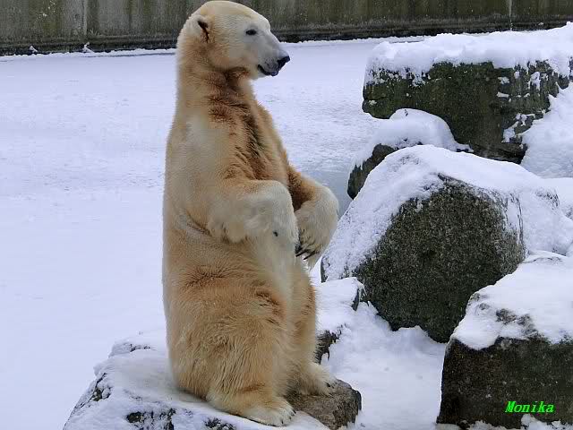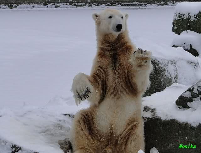 Heute Morgen war ich zuerst ganz alleine am Bärengehege. Knut schaute mal kurz hoch, und das war`s. Einige Zeit später stellte er sich auf und schaute um sich. Dann kam Spreewaldmarion um die Ecke. Sie begrüßte Knut und winkte ihm zu. Was macht Knut? Er winkte zurück. Nicht nur einmal, nein gleich zwei bis dreimal. Was hat sie, was ich nicht hab?