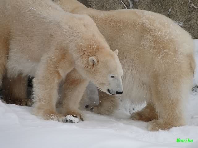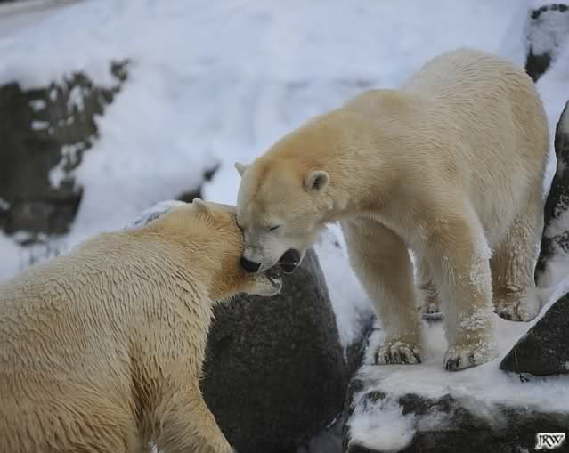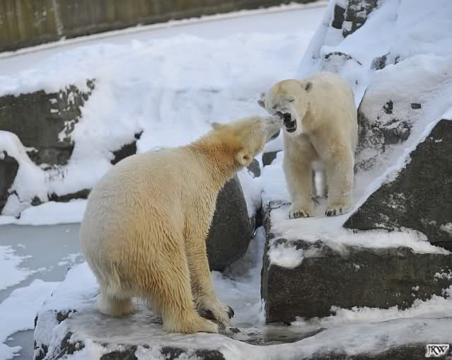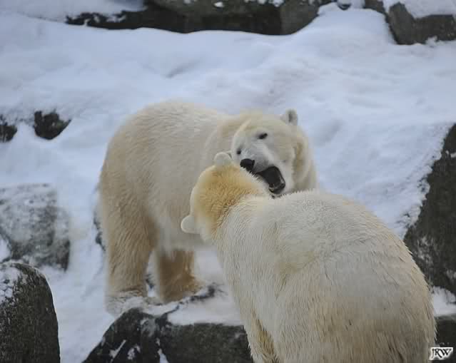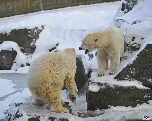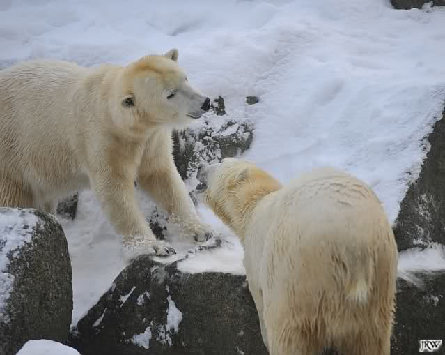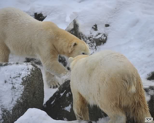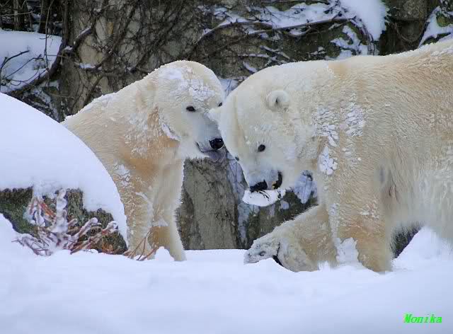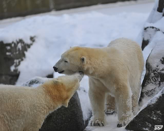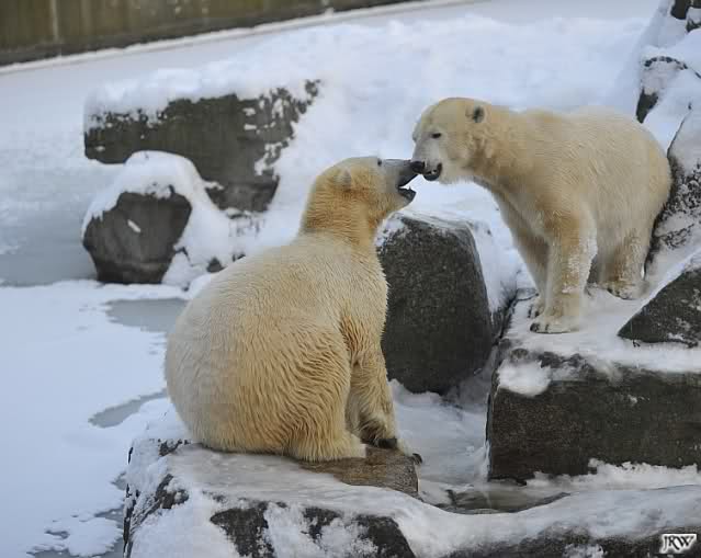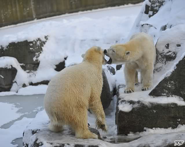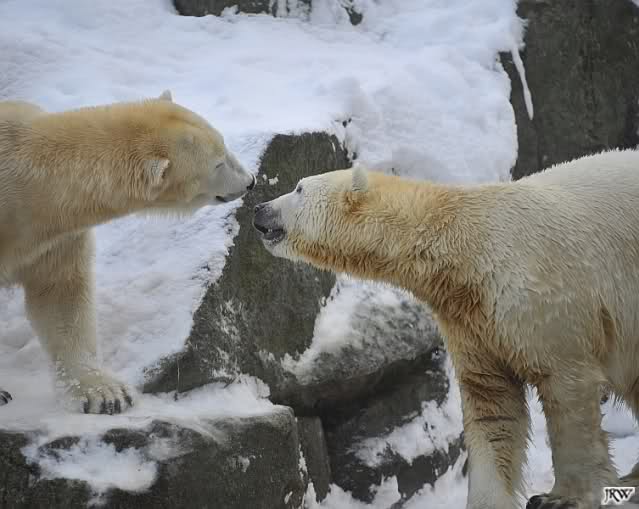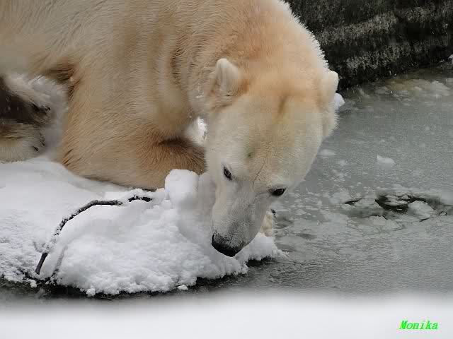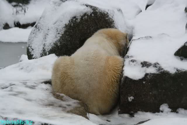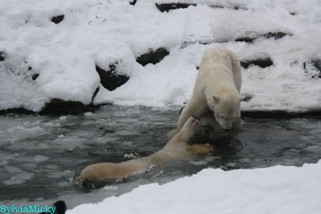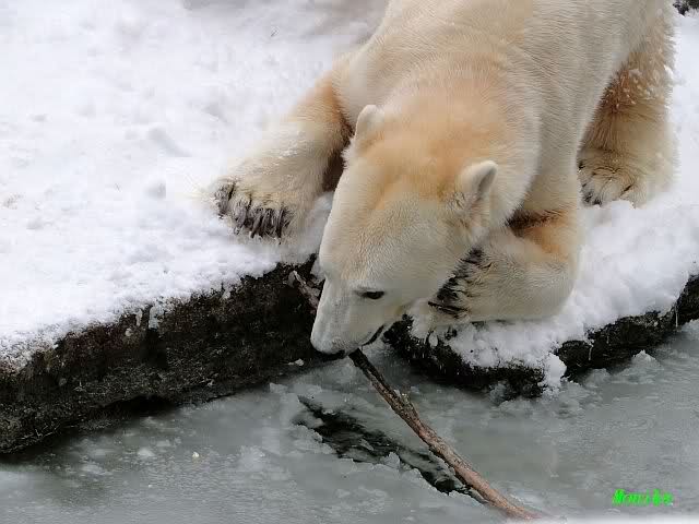 Für ein Weilchen war allgemeines Ruhen angesagt (ich meine nicht die Bärenfreunde sondern natürlich die Bären). Nachdem Monika schweren Herzens gegangen war, weil sie zu sehr schwitzte (ja, Ihr habt richtig gelesen), wurde es sooo schön. Tosca kam zu Knut und für lange Zeit spielten die Beiden miteinander. Der Schnauzenkontakt wollte garnicht aufhören. Wenn Tosca aufstand um fortzugehen, machte Knut Schritte auf sie zu. Wollte Knut gehen, streckte sich Tosca zu ihm und alles fing von vorn an. Hinterher bemerkte jemand, dass Tosca Knut nur bezirzt hat, damit sie an seinen auf dem Eis liegenden Stock herankam. Selbstverständlich nicht!! Sie fand ihn nach dem gemeinsamen Spiel nur interessant. Außerdem tat sie Knut einen Gefallen. Er hatte lange versucht den Stock zu bekommen, aber traute sich nicht auf das Eis. Tosca schwamm einfach hin und angelte den Stock, schob ihn unter die Eisdecke und holte ihn auch wieder hervor.