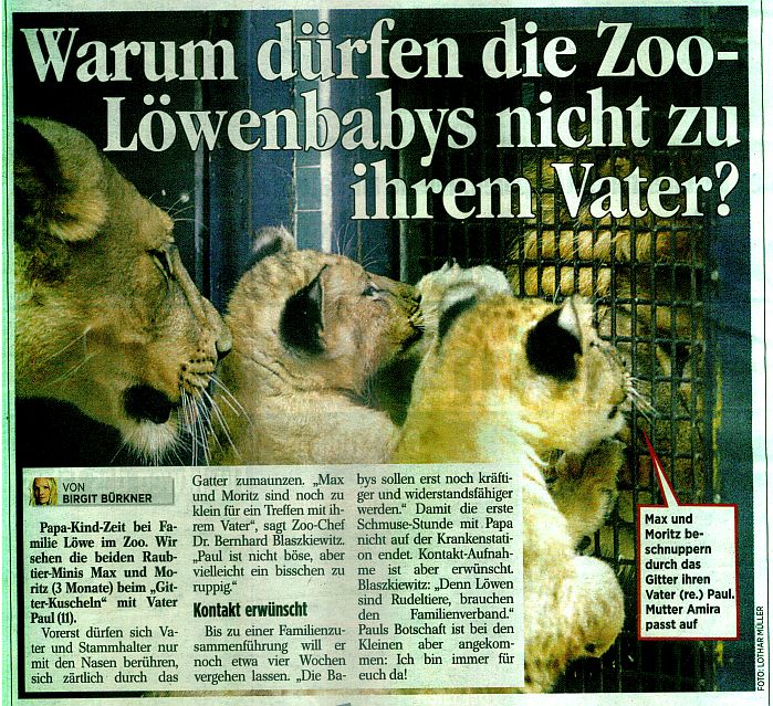 Da frage ich, muß so etwas sein? Wenn die Natur schon nicht mehr will, warum in aller Welt müssen wir Löwenbabys haben, die hinterher als Erwachsene niemand braucht und vielleicht , wie in Basel, umgebracht werden?