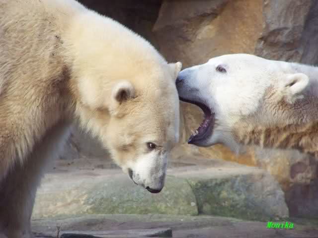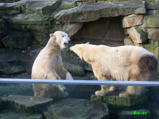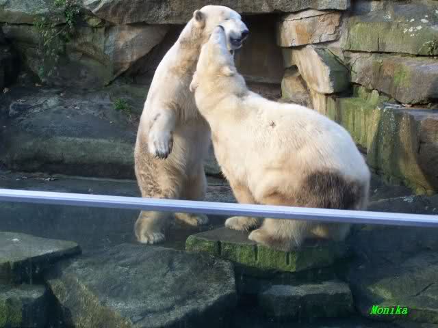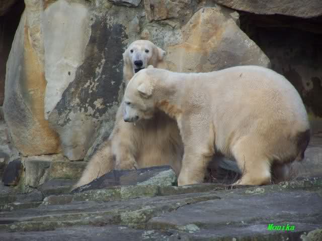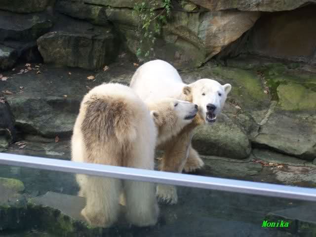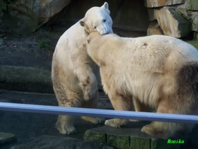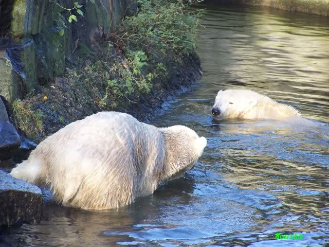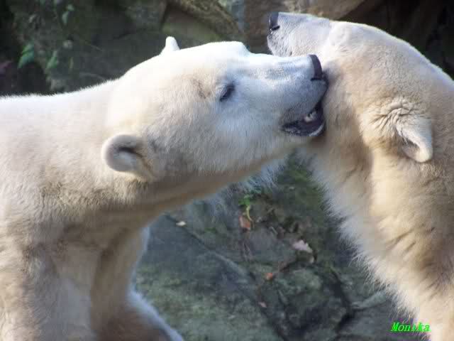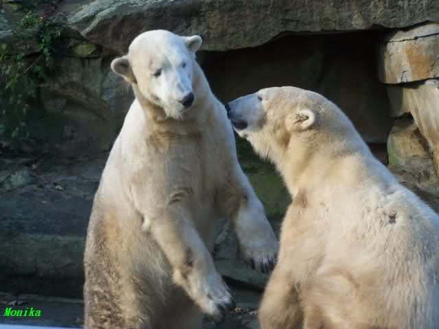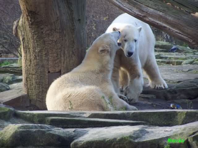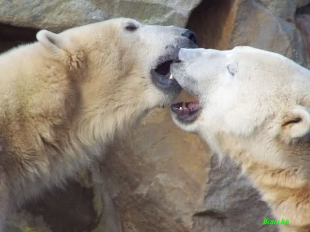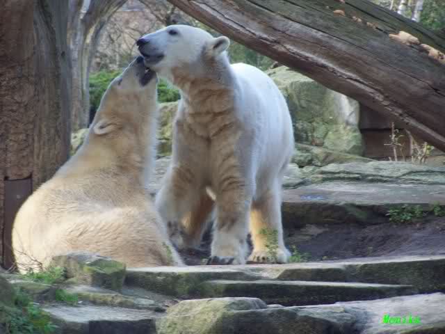 Eine Geburtstagstorte hat Gianna zwar nicht bekommen, aber viele,viele Küßchen von Knut. Als ich heute Morgen im Zoo ankam, schliefen die Beiden noch. Aber nicht lange. Gianna ging ganz vorsichtig zu Knut und er schaute sie an, und schon gab es den ersten Geburtstagskuß. Und Knut hatte von gestern zu heute nicht vergessen wie schön es war. Die Beiden machten heute da weiter, wo sie gestern aufgehört haben. Sie tobten über die Anlage und immer wieder wurde gebusselt. Ein gemeinsames Bad gab es auch wieder.