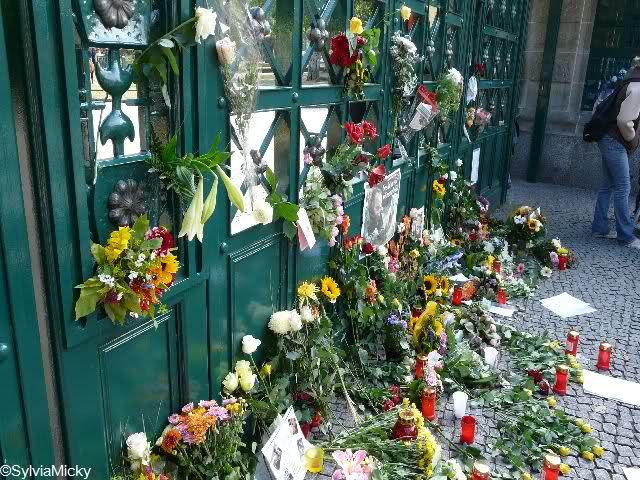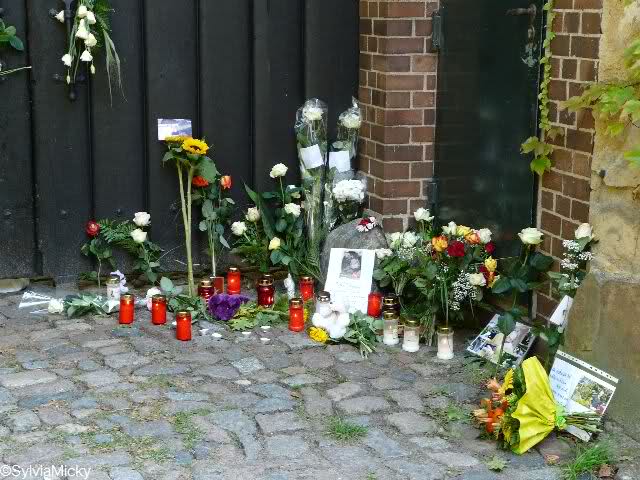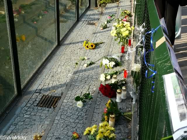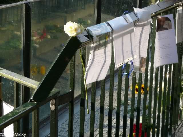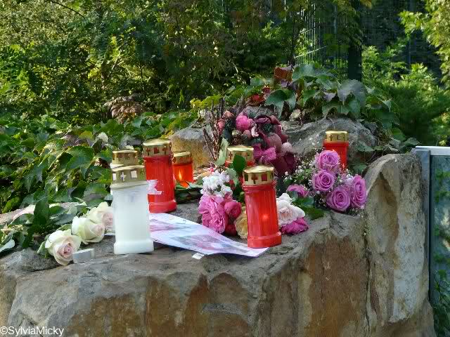 Ich ging zum Bärentor. Auch dort lagen sehr viele Blumensträuße. In den Ritzen des Bärentores steckten weiße Rosen. Überhaupt war das heute die vorherrschende Farbe, ich habe es ja schon geschrieben. Aber auch andere Blumen gab es, z.B. Sonnenblumen und Alpenveilchen. Dazwischen immer wieder Bilder, Kinderzeichnungen, liebevoll gestaltete Briefe und auch Plüschtiere.