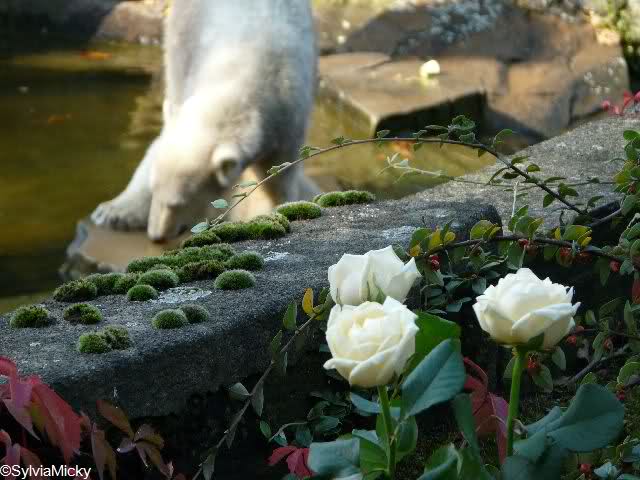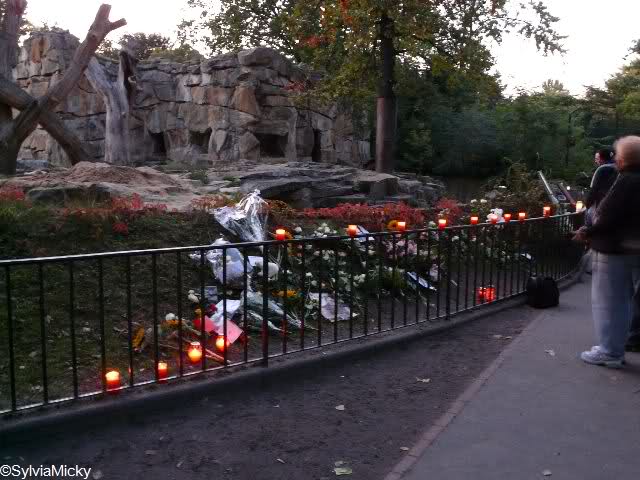 Ich ging zu Knuts Anlage. Dort waren nur wenige Menschen. Aber es lagen bereits viele Blumen da. Wir Knutianer müssen alle vom selben Geist beseelt sein. Ich saß viele weiße Rosen. Einzeln, in Sträußen und in Gestecken. Dazwischen auch immer wieder Bilder und Kinderzeichnungen. Knut hatte einen frischen Sandhaufen bekommen.