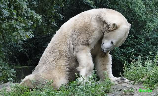 daraus, wie die drei grossen Eisbärinnen jetzt miteinander umgehen, scheinen sie für mich ohne Lars zufriedener zu sein. Ich hörte, dass Tosca manchmal ganz schön kraftig zur Sache gehen soll, aber diese gegenseitig-Putz-Fotos, so wie wir sie hier im Forum zu sehen bekommen, habe ich vorher so noch nicht gesehen. Die Frage ist: reisst man so eine gewachsene Gruppe auseinander. Wir alle wissen, dass Tosca eine sehr wechselvolle Vergangenheit hatte und nur durch intensive Beschäftigung vom "Weben" abgehalten wird/werden kann. Es hat ja ein Pfleger hinbekommen, wenn er sich den ganzen Tag mit Tosca beschäftigte.
