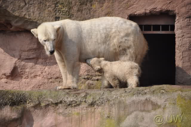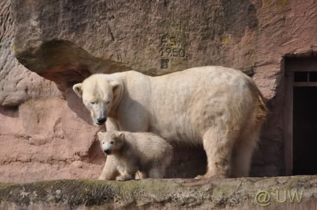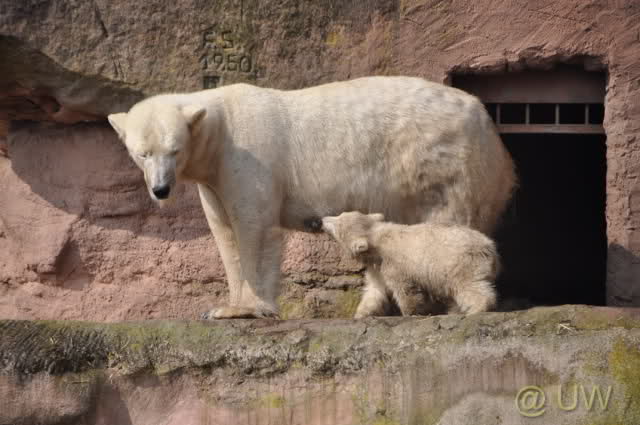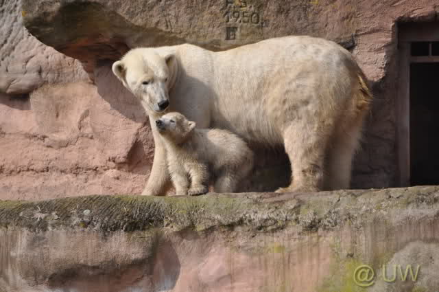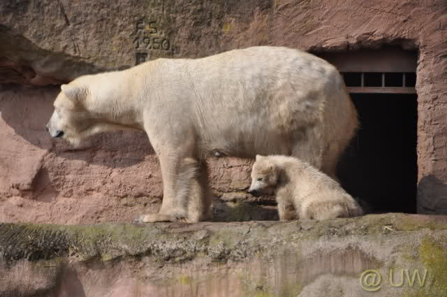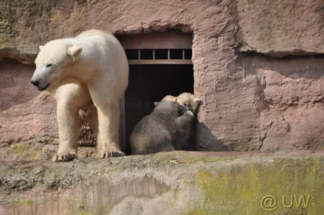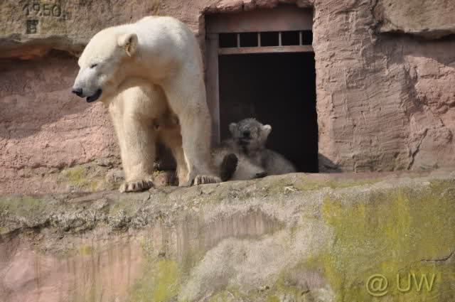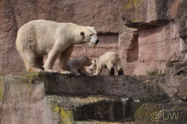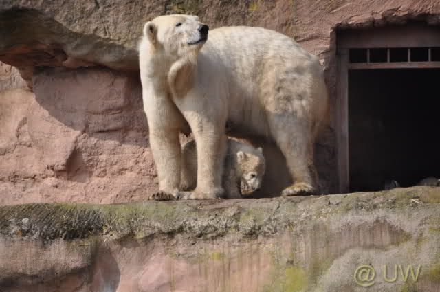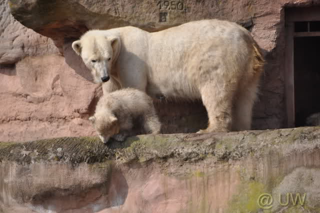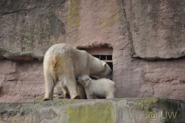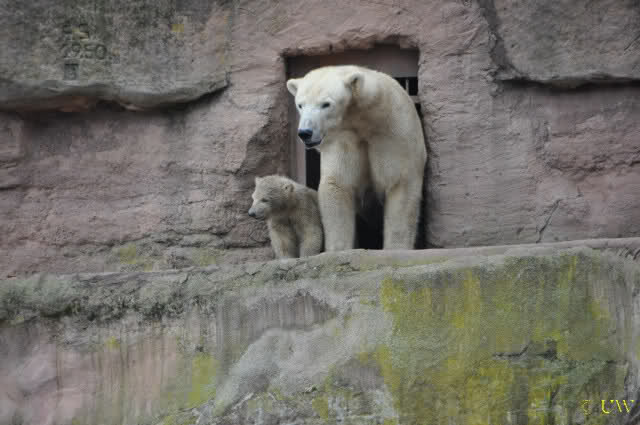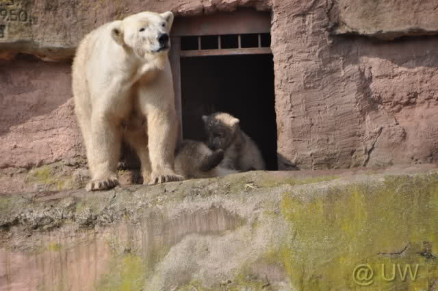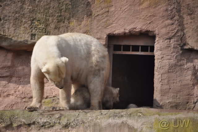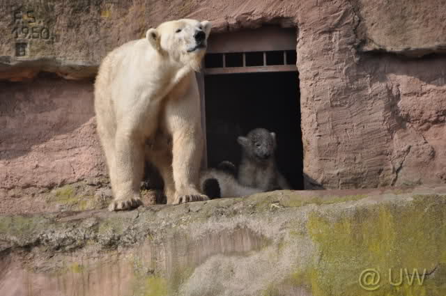 Um 14:30 Uhr gibt es jetzt wieder eine Eisbärfütterung. Obwohl Felix auf der Anlage war ist Vera mit ihren Kleinen heraus gekommen, allerdings auch hier erst nach einiger Zeit. Vorher war sie im Eingang zur Höhle gesessen und hat die Kleinen nicht heraus gelassen.