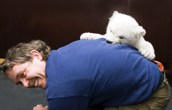 Milch, Hundefutter, Kalbsknochen - alles lecker, aber nichts geht über einen saftigen Pflegerrücken. Noch lacht Pfleger Maußner über Klein-Flockes Beißattacken... (Foto: Ralf Schedlbauer)